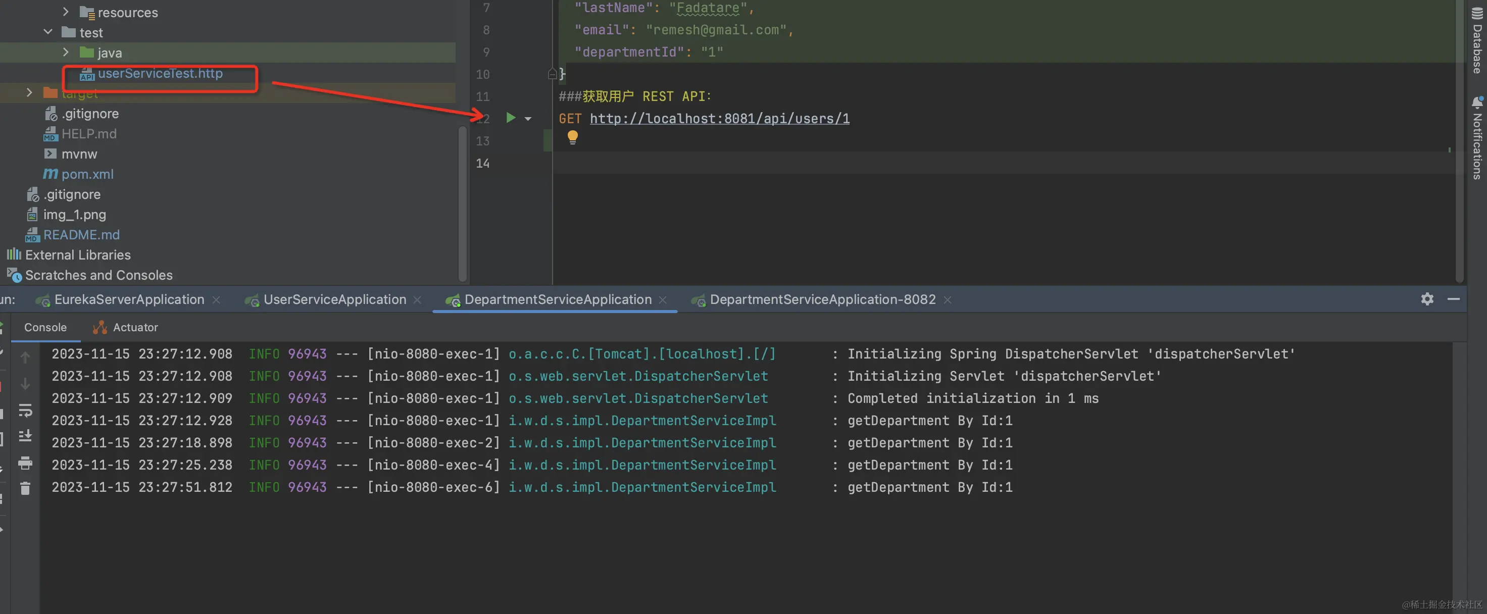 在部门服务的DepartmentServiceImpl的getDepartmentById方法增加调试日志,如果调用到此接口,会打印getDepartment By Id