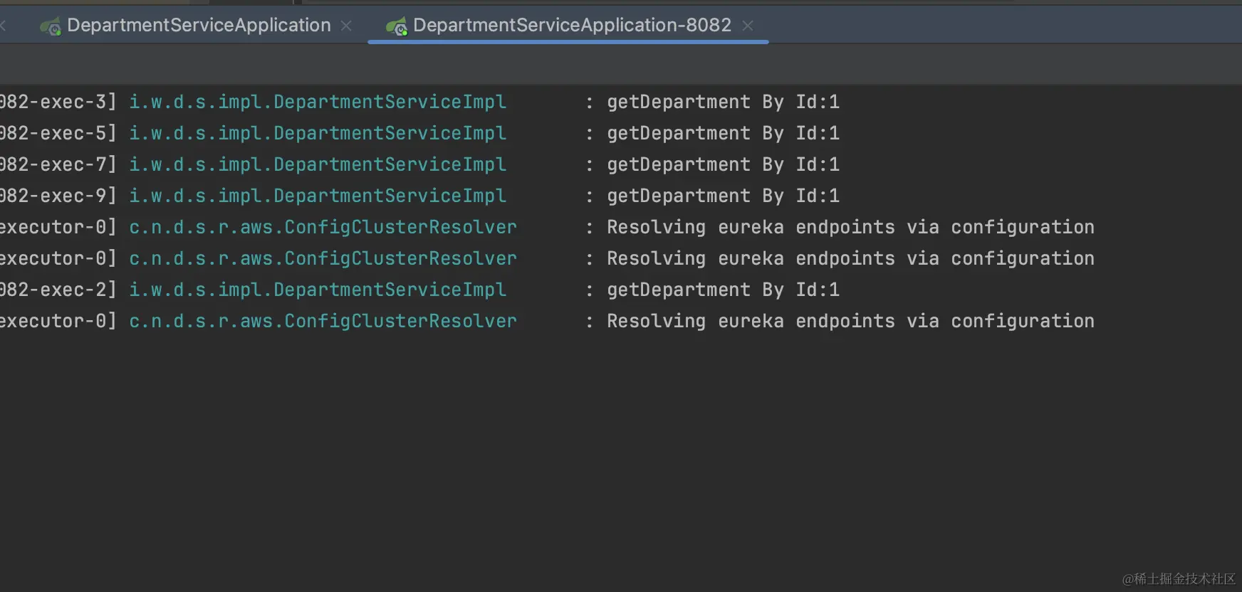 多点击几次,会看到2个部门服务控制台都会打印,getDepartment By Id:1,这里使用的是Spring Cloud LoadBalancer提供的轮训算法