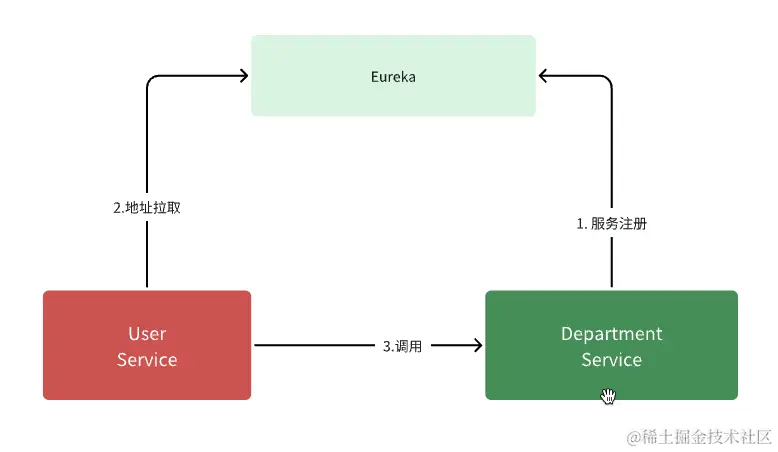 我们部署一个Eureka Server,并将我们的微服务(部门服务和用户服务)作为 Eureka 客户端,注册到Eureka Server,同时使用用户服务调用根据部门服务的Service ID 来调用部门服务相关接口。