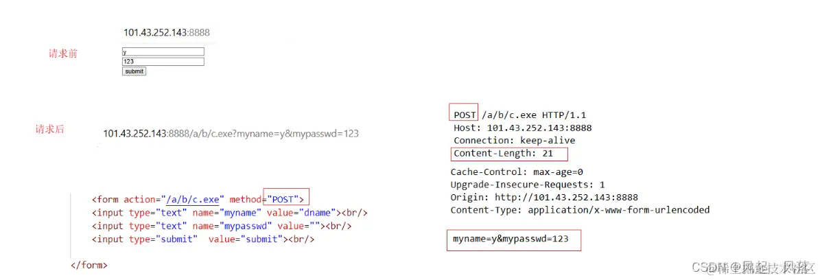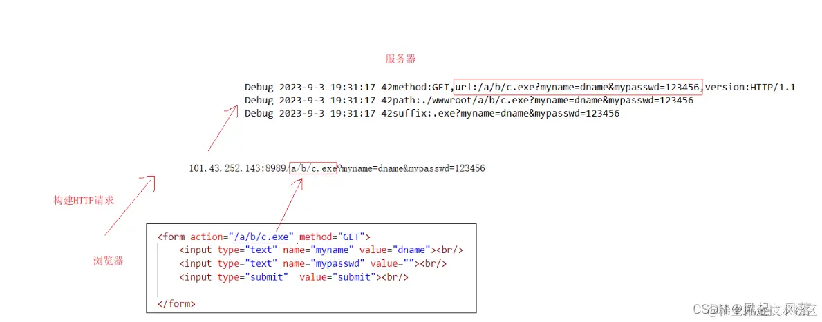 在输入名字 和密码后,点击提交,此时跳转页面的网址为http://101.43.252.143:8989/a/b/c.exe?myname=dname&mypasswd=123456