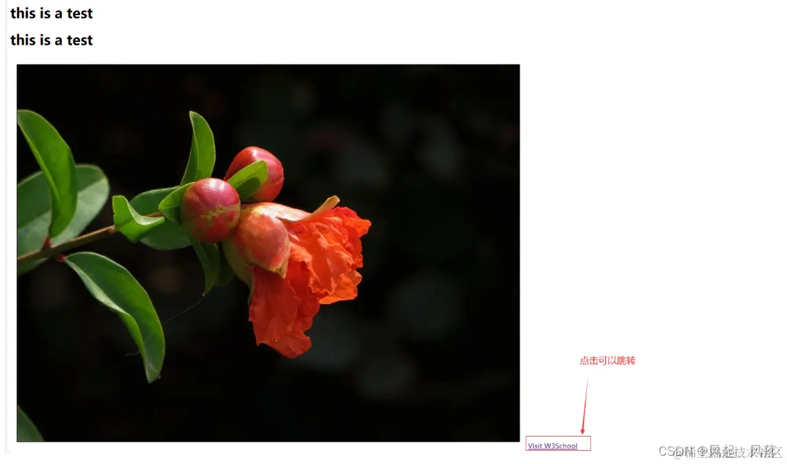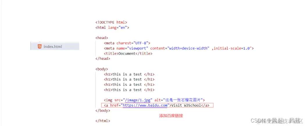在index.html 中,添加一行表示 百度链接,通过点击 Visit W3School 文字进入