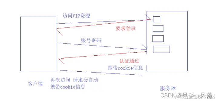 服务器中有很多资源 当请求某种资源时,若服务器发现没有登录,就会要求客户端进行登录 在输入完账号密码后,服务器就会对账号密码进行认证 若认证通过了,就会返回认证成功的消息