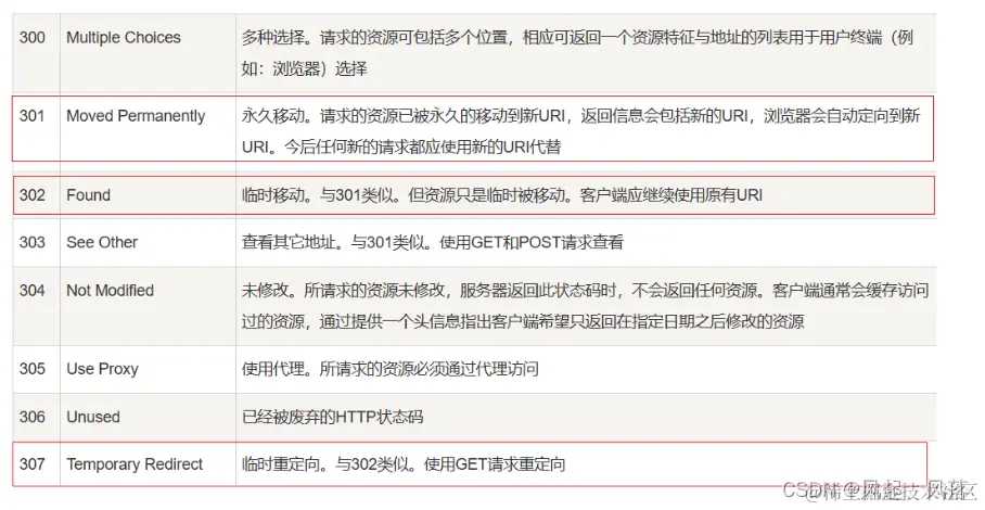 主要看 301 302 307 三种 状态码 301表示 永久重定向 302与307 表示 临时重定向