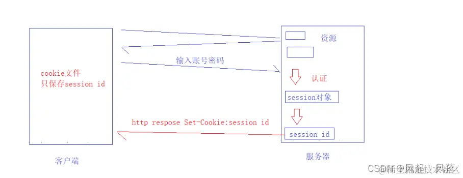 当登录时 需要使用 POST方法 ,输入账号密码 在输入完账号密码后,服务器就会对账号密码进行认证 若认证通过后,新方案就会在服务器形成一个session对象 (用当前用户的基本信息 填充) 以及 seesion id (以10/16进制形成的序列 保证是唯一的) 把session id 通过http 响应 传给 客户端