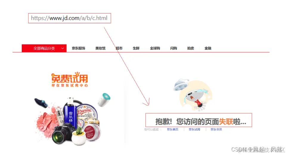 寻找 www.jd/a/b/c.html ,由于京东中并不存在这个页面,所以会报错 所以404报错,属于客户端报错,表示客户端属于非法请求 若客户端属于非法请求,服务器要告诉客户端,该请求是不合理的