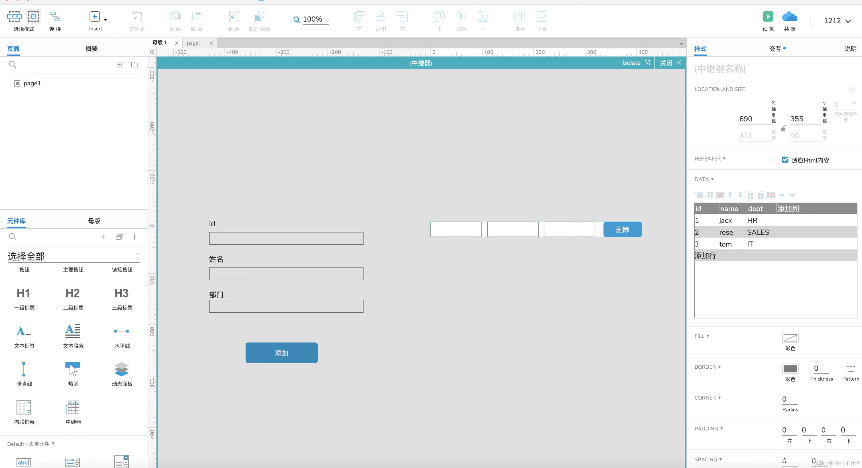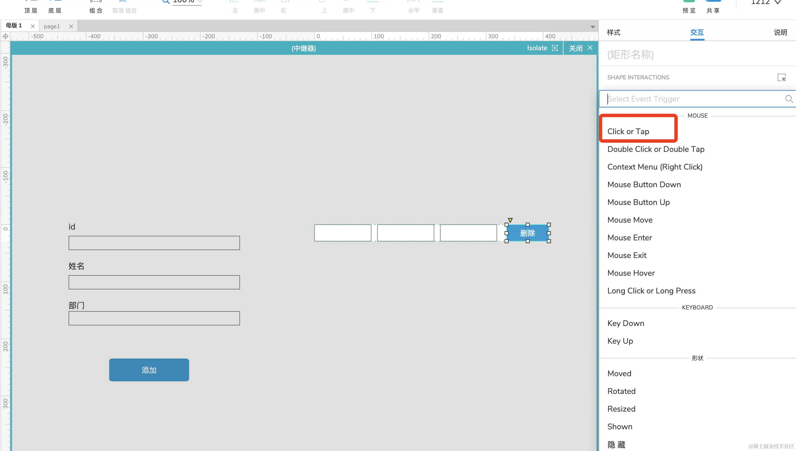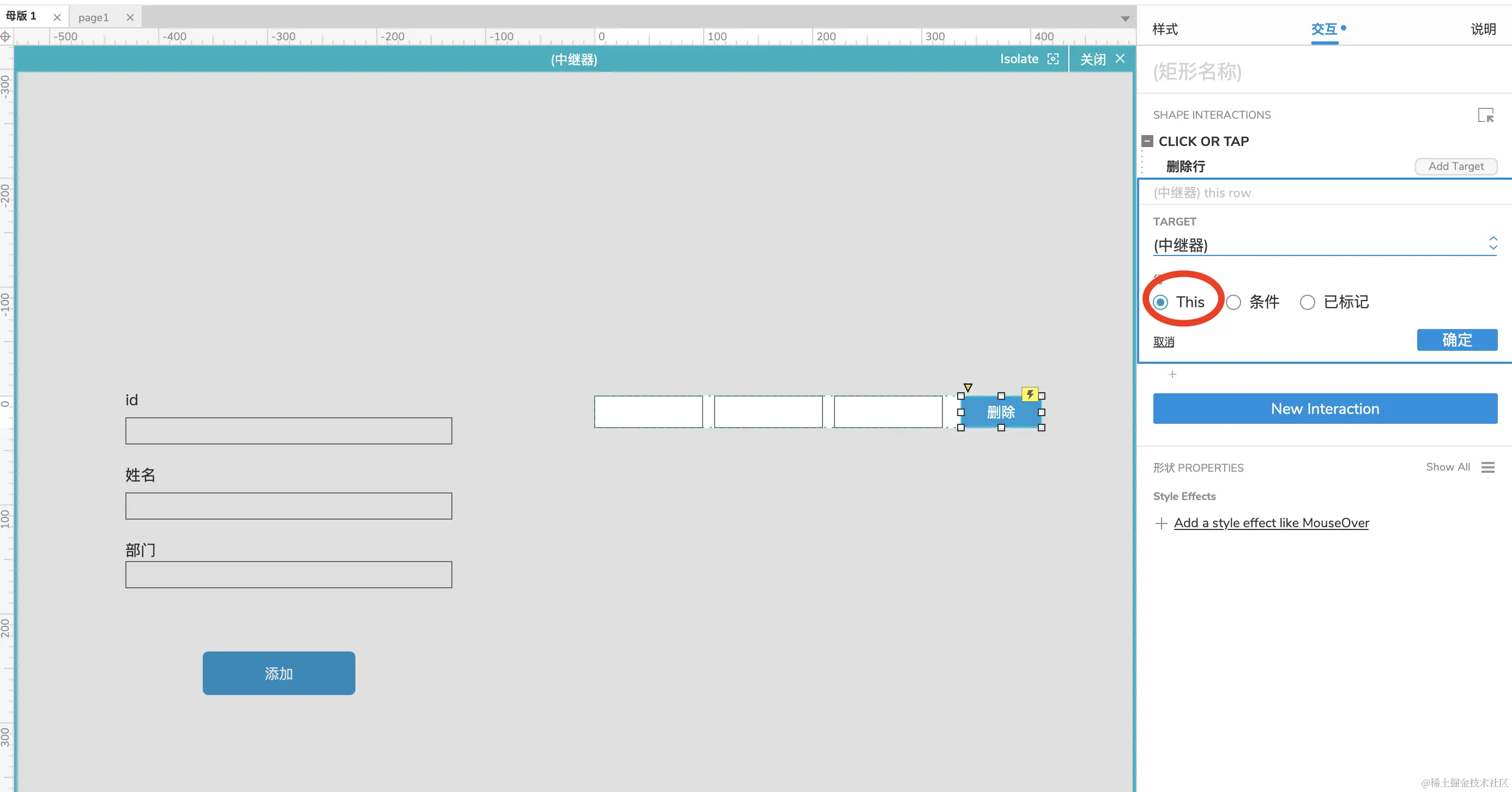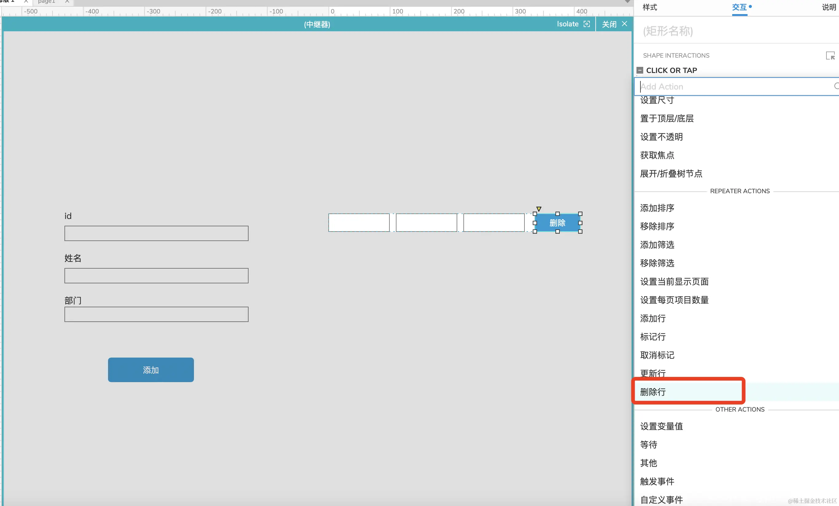Axure中继器的使用-删除数据(三) xyphf_和派孔明 2023-11-16 123 阅读1分钟 双击中继器,添加删除按钮 给按钮添加点击事件 点击删除行 选择删除当前行,点击确定 这时候中继器的删除就起作用了