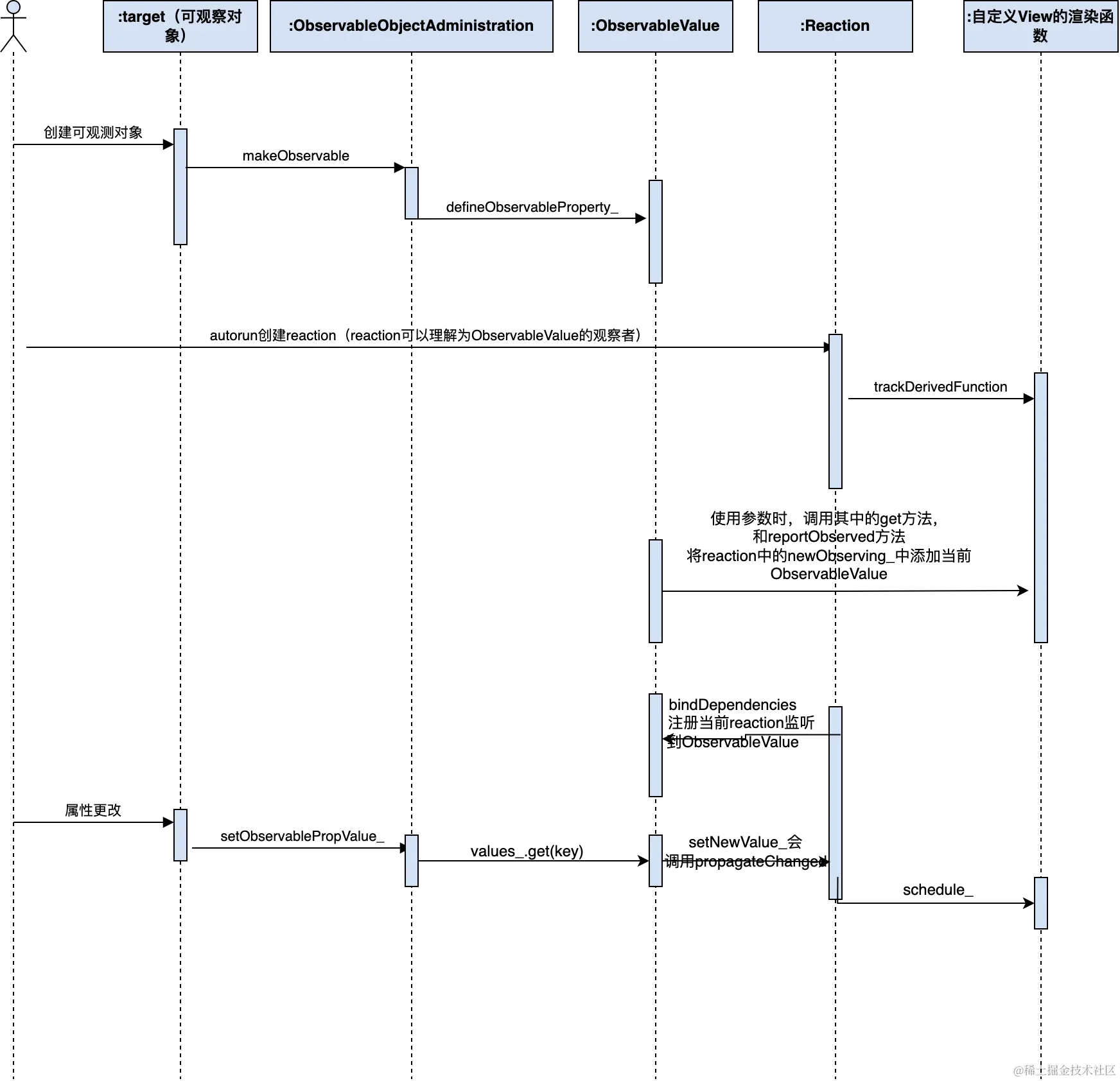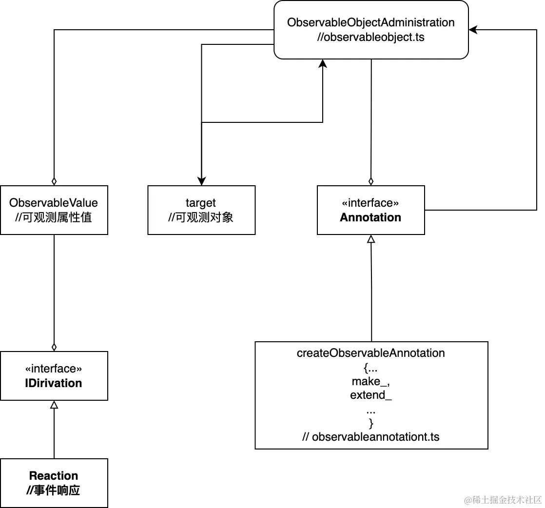 上面的Animal,在调用makeObservable后会创建一个ObservableObjectAdministration,并且会作为一个隐藏属性挂在Animal对象上,之后会调用ObservableObjectAdministration的defineObservableProperty_,这里会对Animal中的每个属性创建一个ObservableValue,并且劫持对应属性的set和get方法。autorun会创建一个reaction,创建后会执行trackDerivedFunction,执行autorun中传入的方法(一般就是组件的渲染),当组件使用其中的状态属性时,会调用Observable的get方法,会调用reportObserved方法,将reaction中的newObserving_中添加当前ObservableValue,之后会调用bindDependencies方法,将当前reaction注册到ObservableValue,reaction其实就可以理解为观察者模式中的观察者。