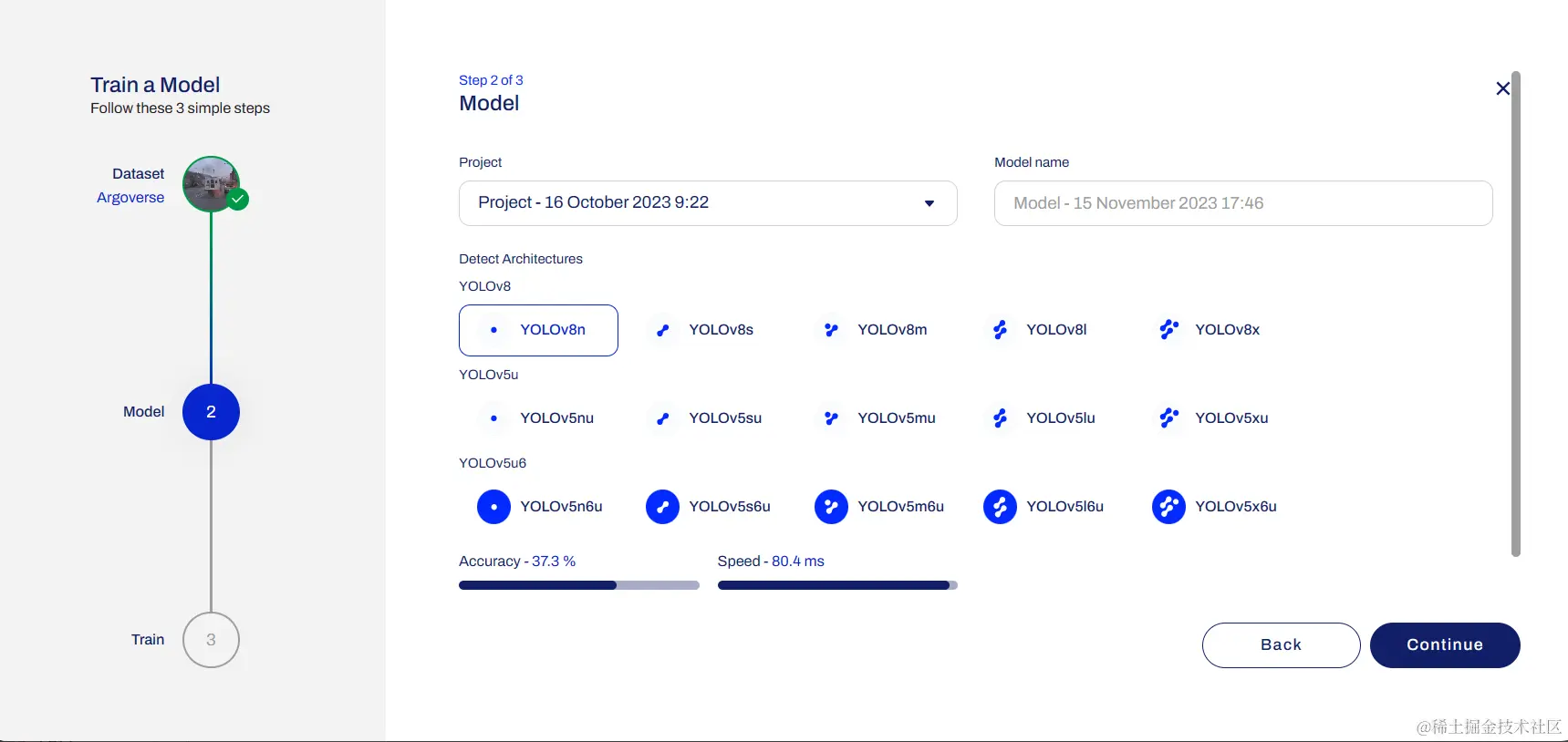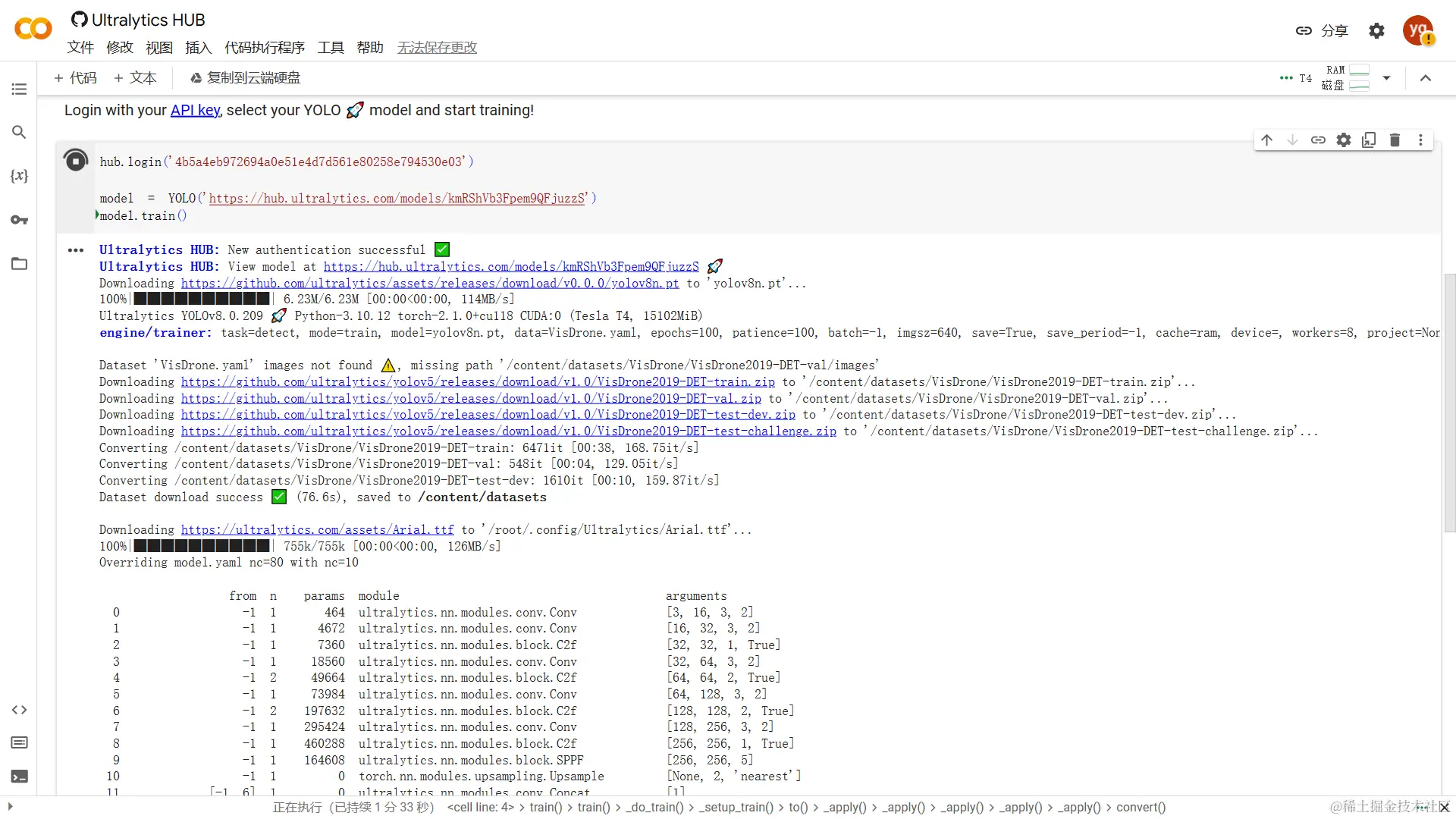 将合成数据上传后,选择YOLO模型版本,确定好YOLO模型版本后,点击【continue】就可以开始使用ultralytics来训练集我们的模型了,如下所示: