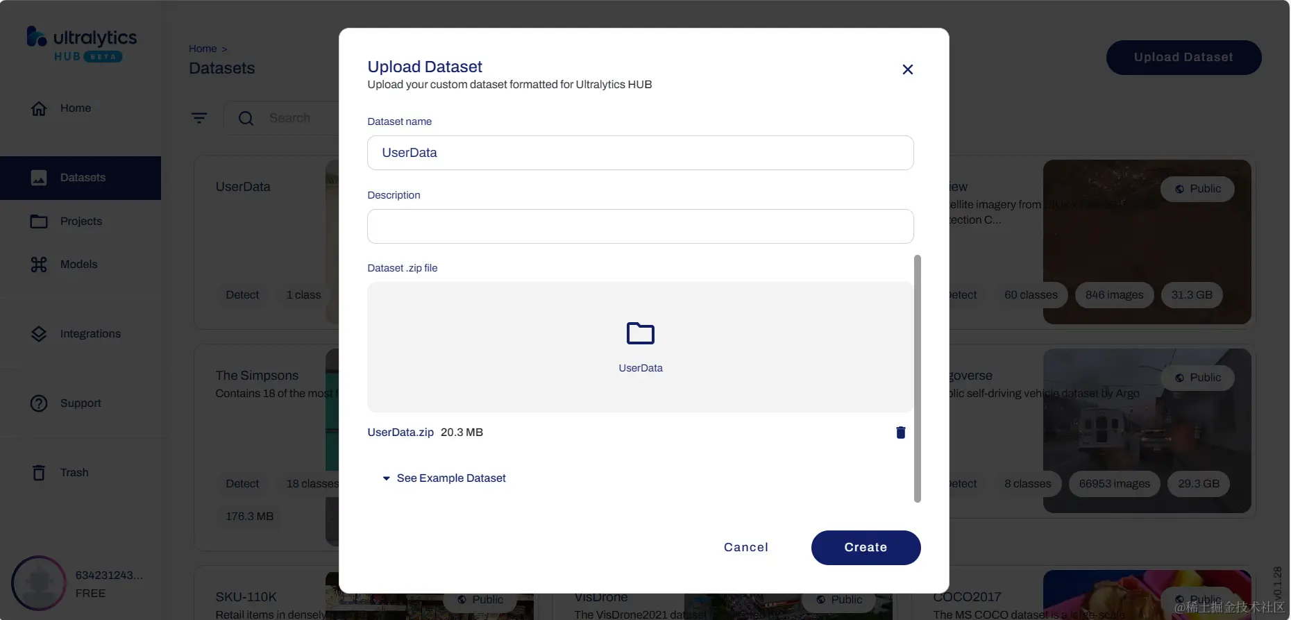 生成数据集后,下一步就是利用Yolo来训练模型,第一步,打开 ultralytics hub 在线训练工具,将刚才生成的数据集上传到ultralytics hub