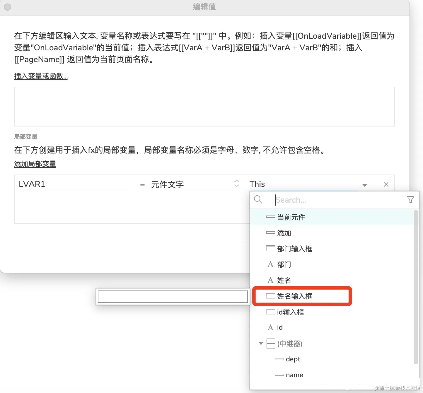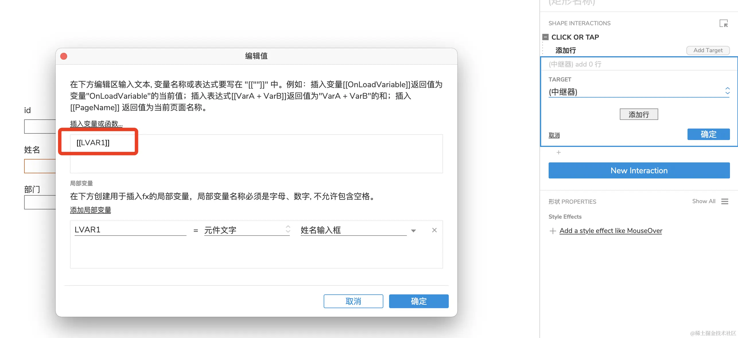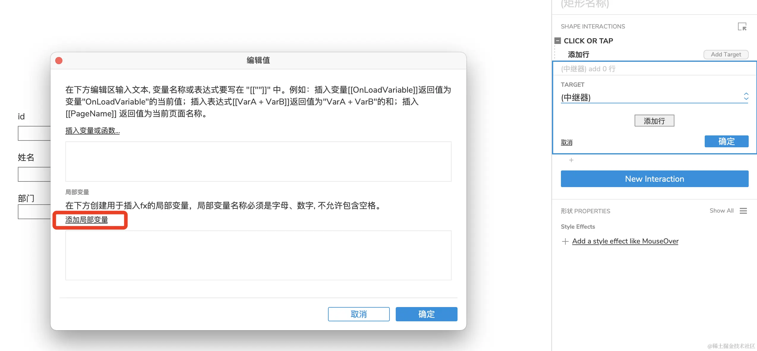 Axure中继器的使用-添加数据(二) xyphf_和派孔明 2023-11-16 236 阅读1分钟 对所有输入框进行命名 点击给添加按钮添加事件 找到中继器动作 举例:添加一个name,点击name下的fx 如何获取输入框? 点击【添加局部变量】 下列操作表示获取【输入框】的【元件文字】赋值给变量LVAR1 在插入变量函数中插入 其他重复操作即可,我们变量名称虽然一样,但是它是局部变量,所有对其他的不影响 这样中继器的列表添加就完成了