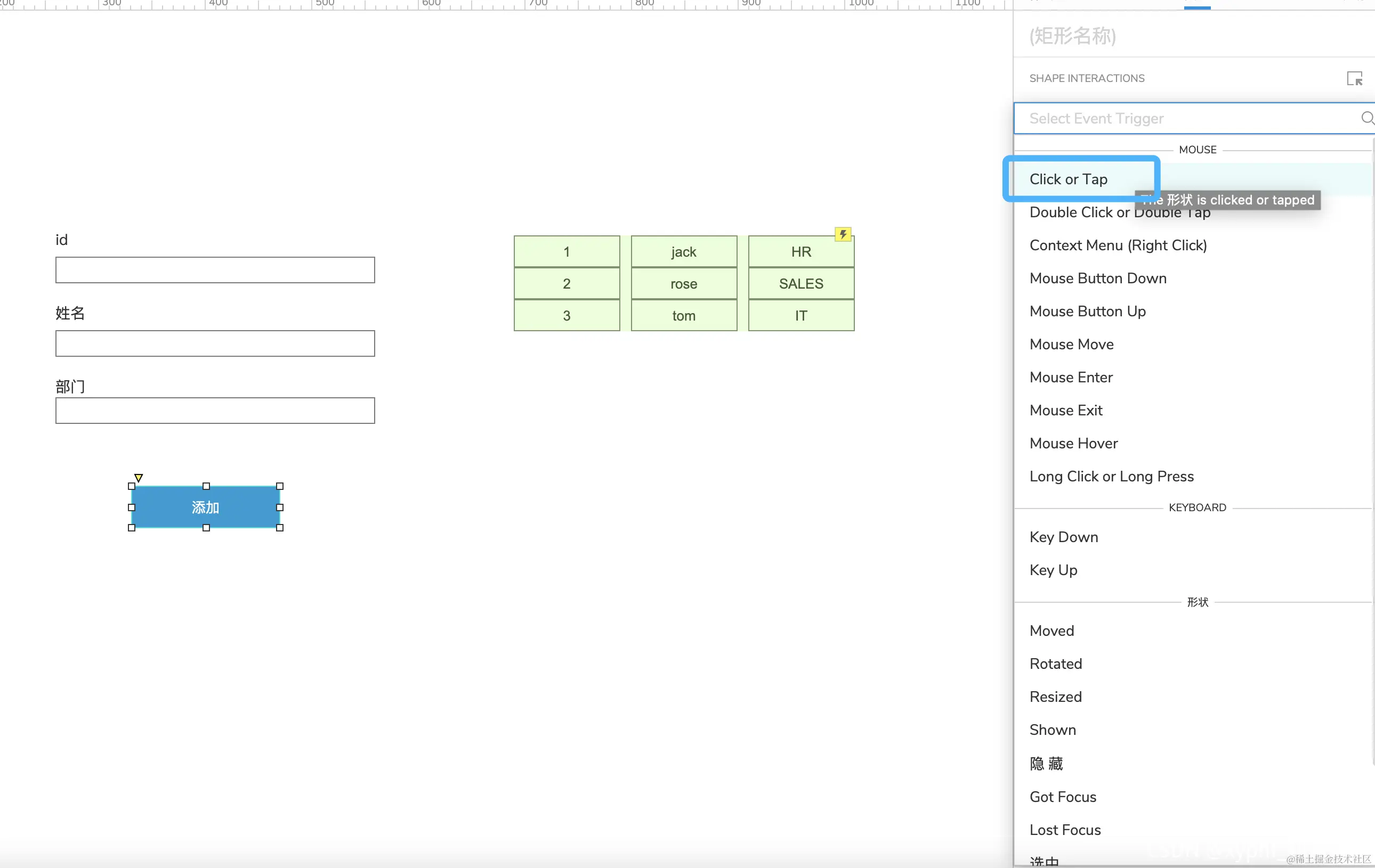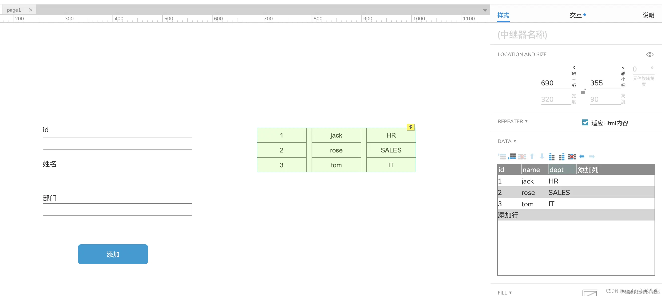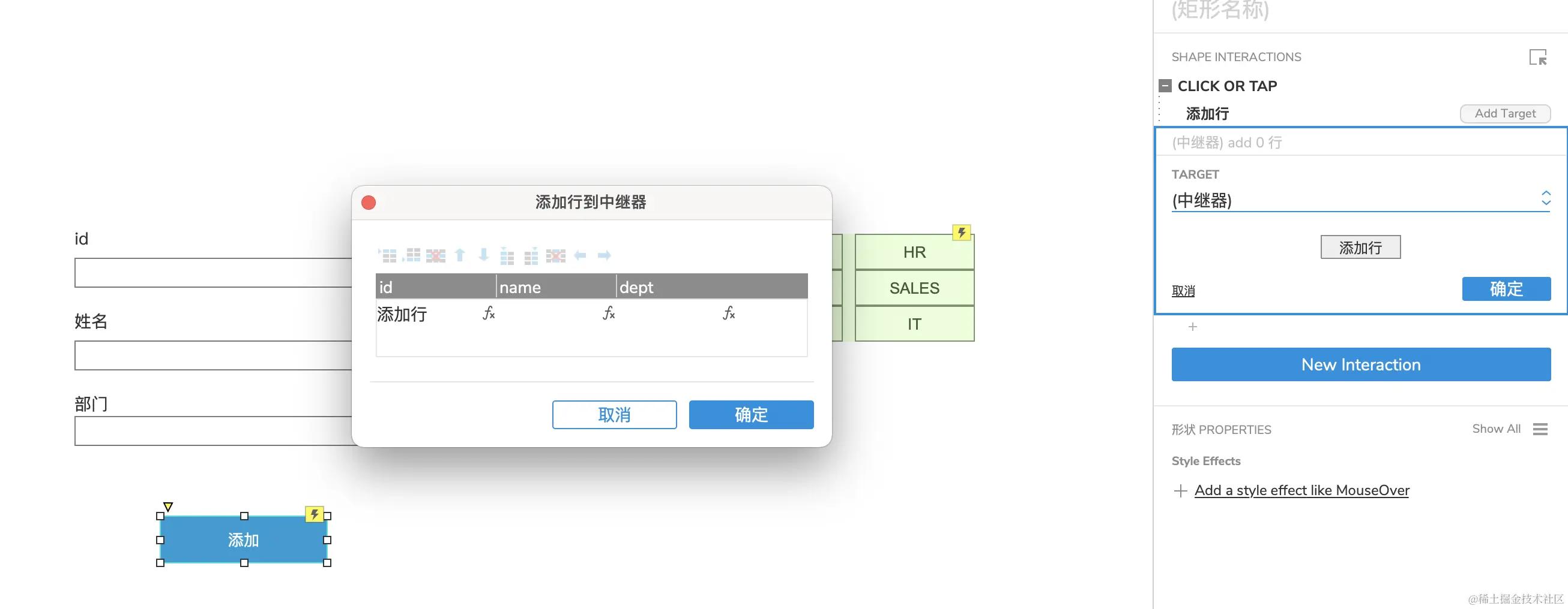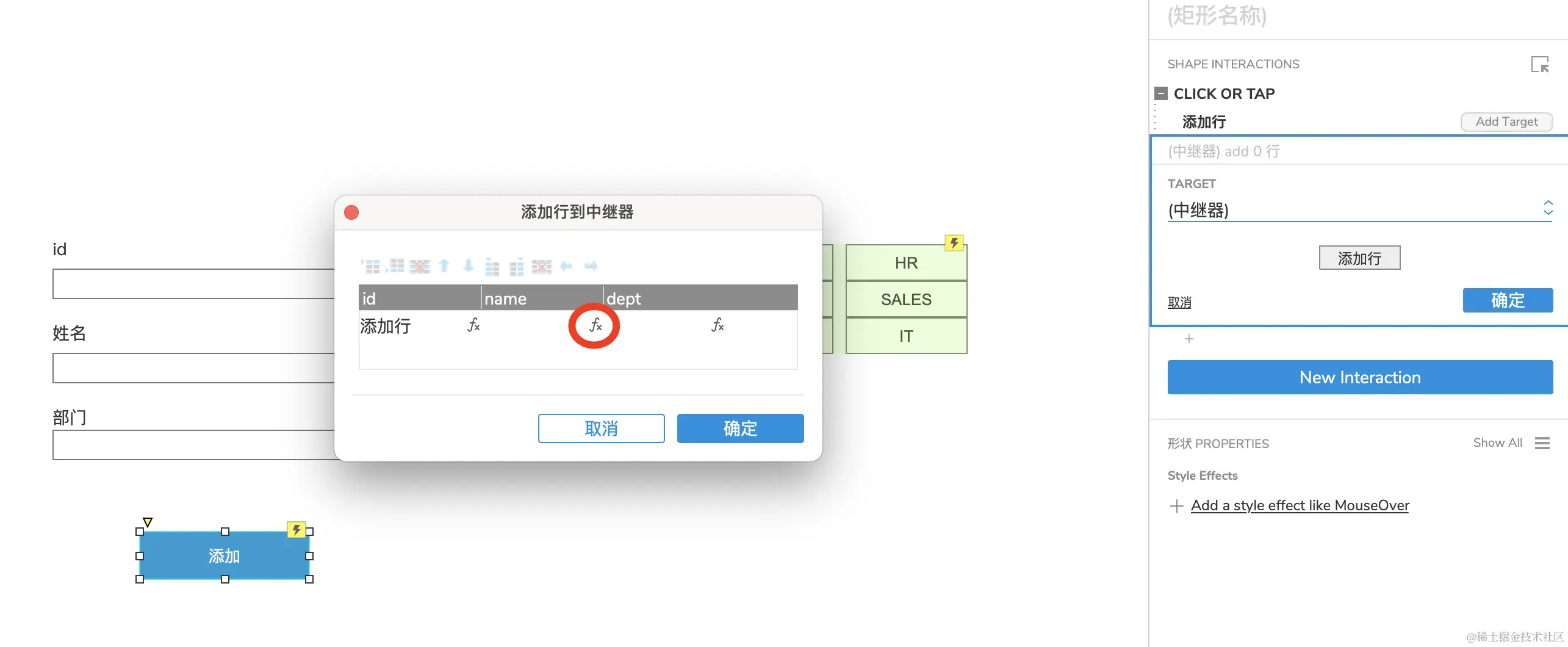 Axure中继器的使用-添加数据(二) xyphf_和派孔明 2023-11-16 236 阅读1分钟 对所有输入框进行命名 点击给添加按钮添加事件 找到中继器动作 举例:添加一个name,点击name下的fx 如何获取输入框? 点击【添加局部变量】 下列操作表示获取【输入框】的【元件文字】赋值给变量LVAR1 在插入变量函数中插入 其他重复操作即可,我们变量名称虽然一样,但是它是局部变量,所有对其他的不影响 这样中继器的列表添加就完成了
