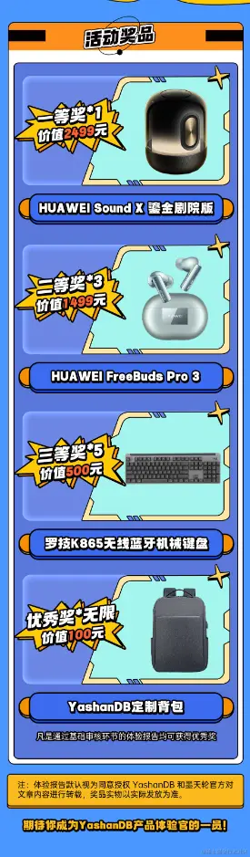 我们特别为本次活动准备了价值千元的华为音响、华为蓝牙耳机、罗技机械键盘、定制背包等超级大奖,快来参与吧~