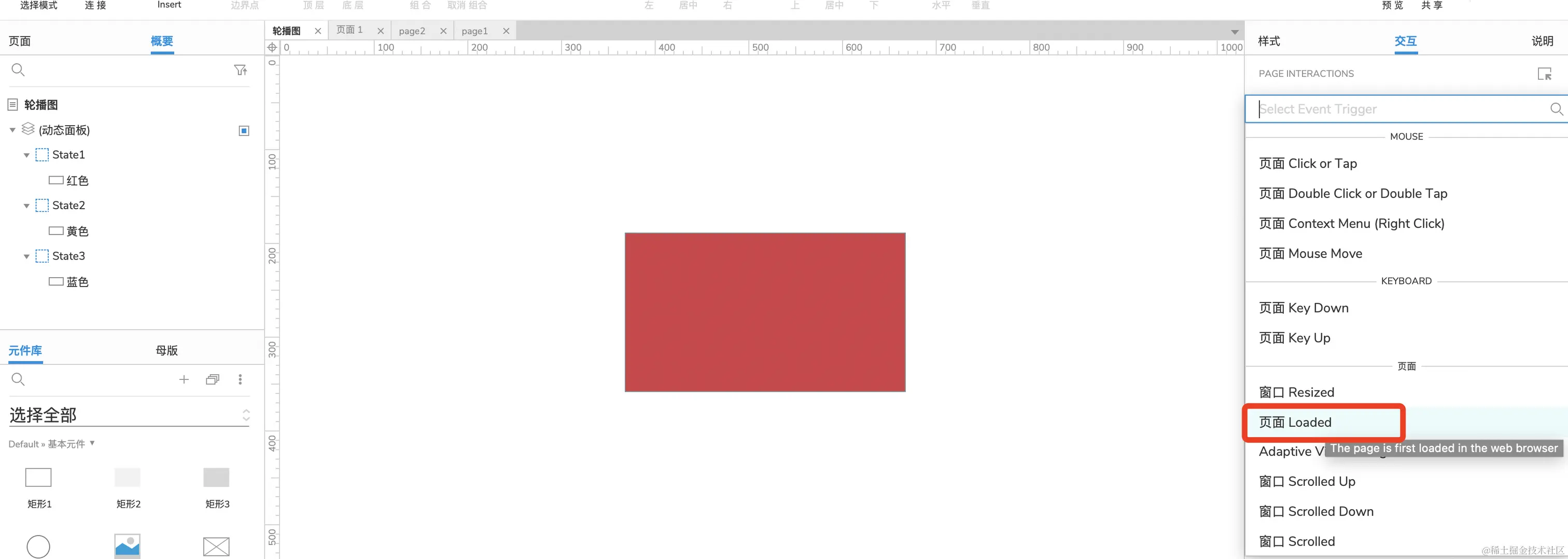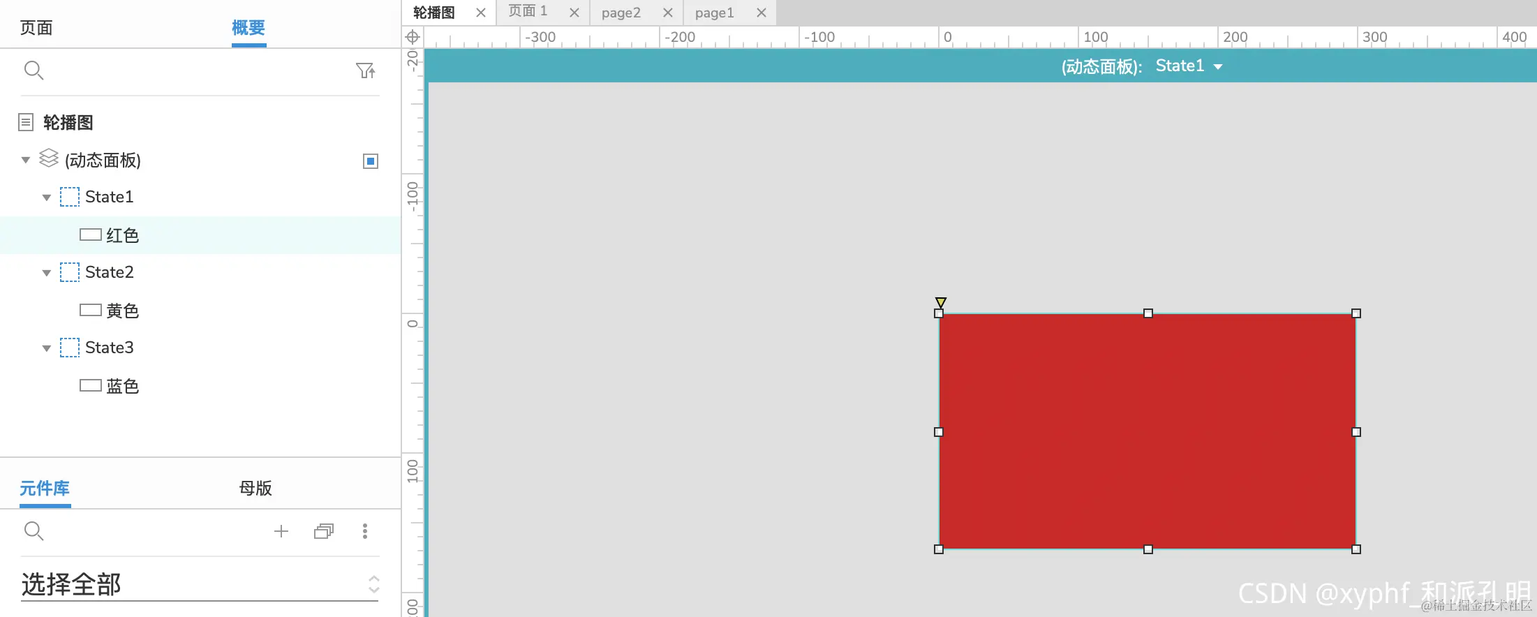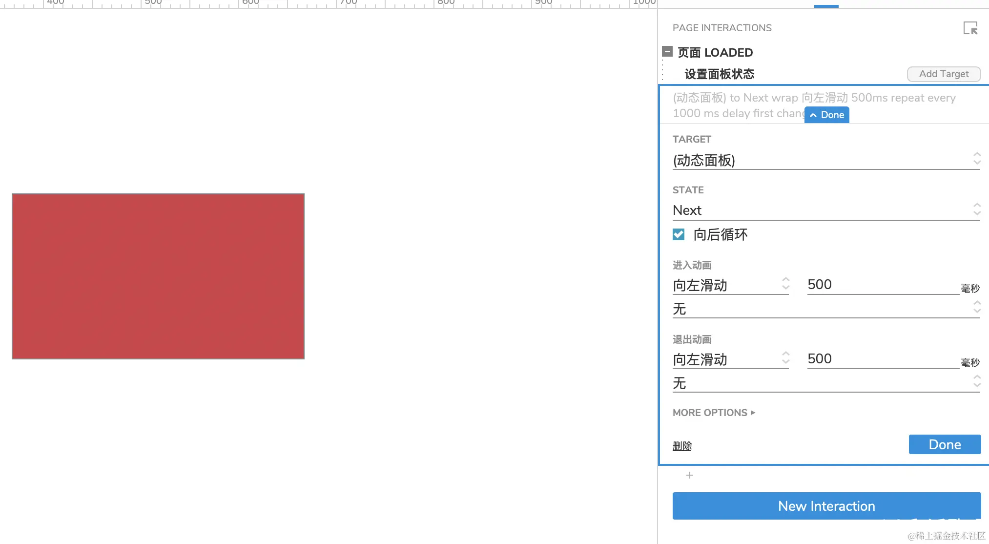 Axure中轮播图幻灯片的实现-动图面板(八) xyphf_和派孔明 2023-11-16 114 阅读1分钟 一、载入时自动切换的轮播图 使用动态面板,将举行转化为【动态面板】 生成三个状态,分别是红黄蓝 我们让它在载入时自动切换 设置调转至下一项,并且向后循环 二、点击切换的轮播图