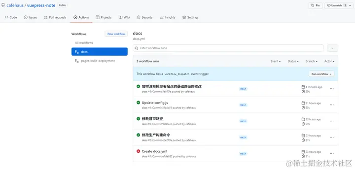 2、文档上写的项目自动生成的打包命令是:yarn docs:dev和yarn docs:build,实际使用中我们往往会直接改成 yarn dev和yarn build,如果改了GitHub Actions里的打包命令也要同步改下;