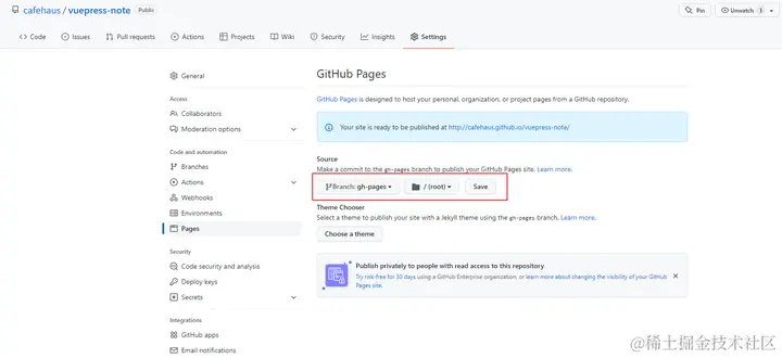3、仓库里的Pages设置分支要选到gh-pages分支,后面的一项直接选根目录/(root),切记最后要点一下后面的save保存,否则不生效哟;