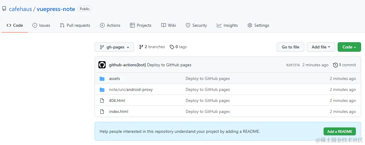 流水线成功了gh-pages分支里就会自动生成最终打包出来的文件,像下面这这样的: