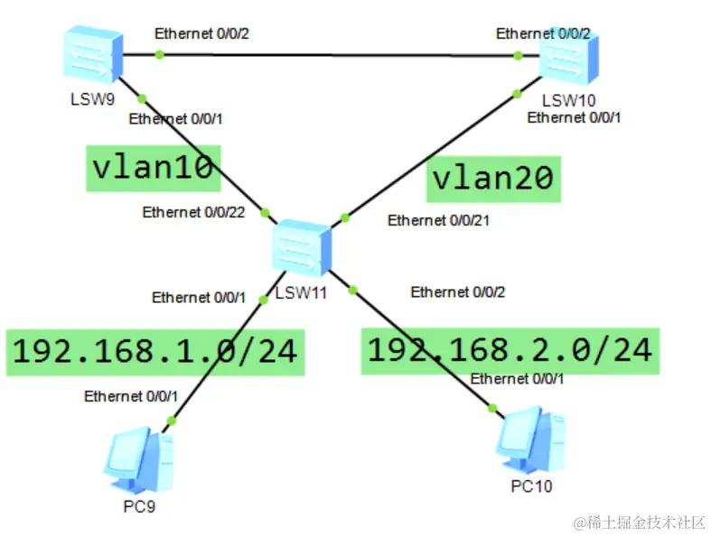 由于LSW9是PC9的网关,而LSW10是PC10的网关,在通信时它们会依据生成树去找网关,这就解决了负载均衡的问题