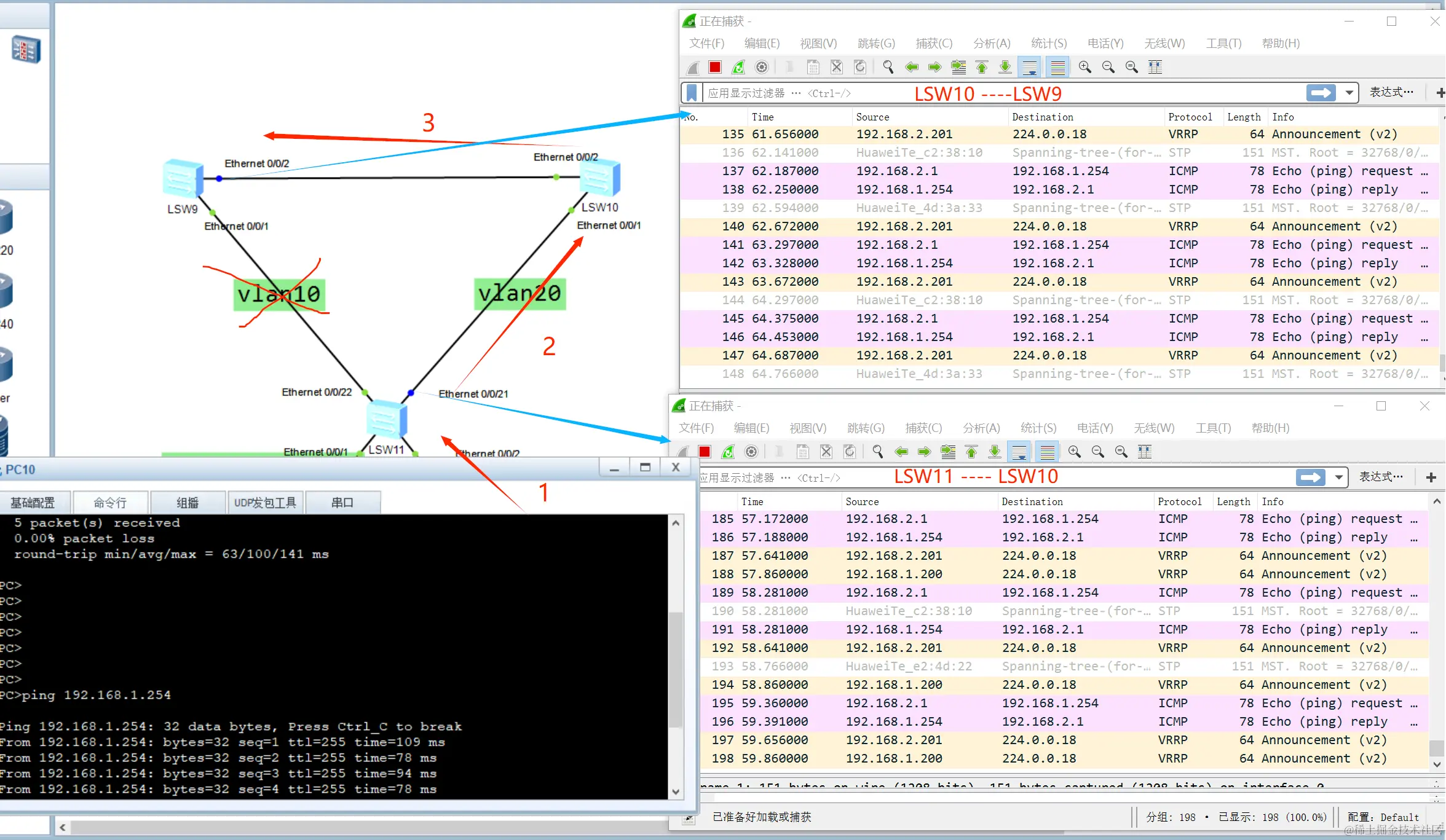 如果是STP协议那么实例20也应该是堵塞的这条路径,但是这是MSTP协议,我们在看看实例20的抓包,相同的也是ping对方的网关,也就是实例10的网关