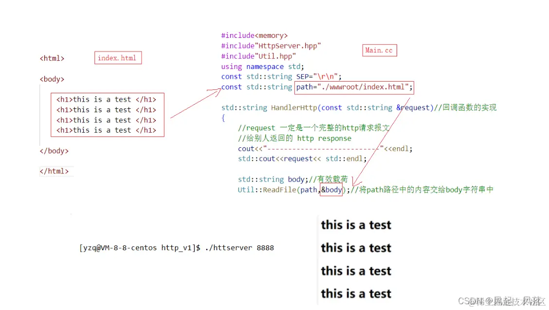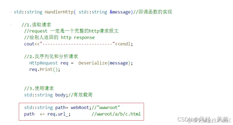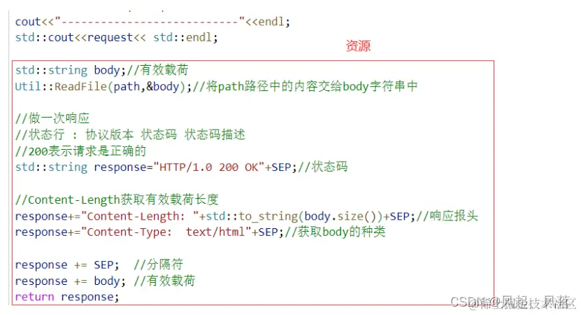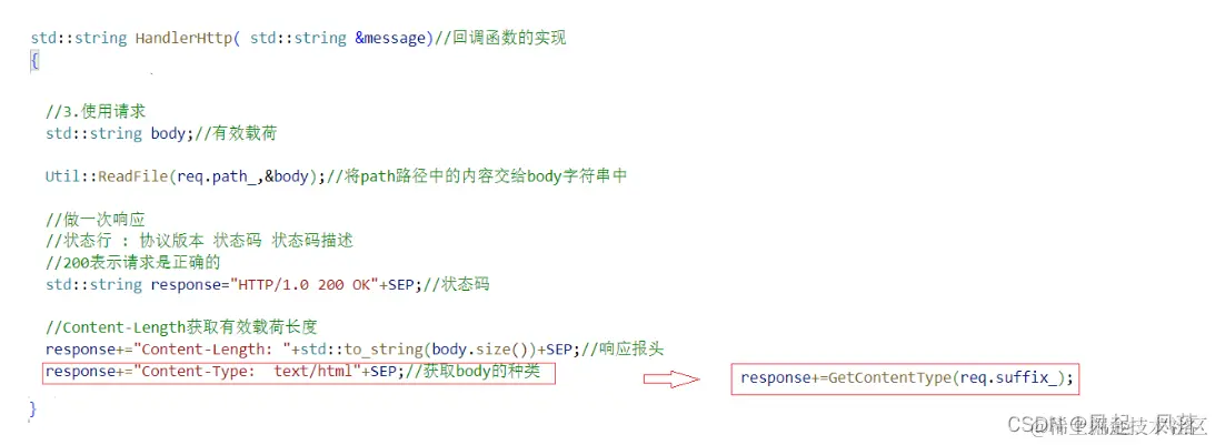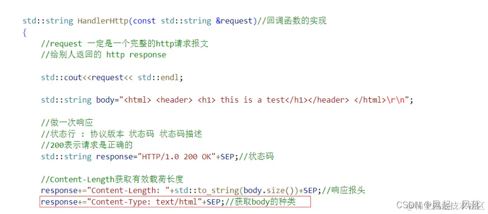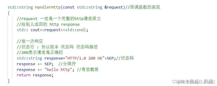 对于回调函数 HandlerHttp,在是一个完整的http请求报文的前提下,分别将状态行 分隔符 有效载荷 添加到 response响应中,并将 响应返回 有效载荷部分以网页部分呈现的