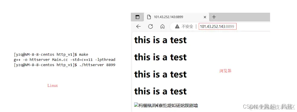当在Linux上运行程序,并输入端口号时 浏览器上 输入 主机IP+端口号 ,就会使主函数 调用回调函数 打印 this a test 同时Linux会出现如下数据 响应的 状态行 响应报头 空行 有效载荷