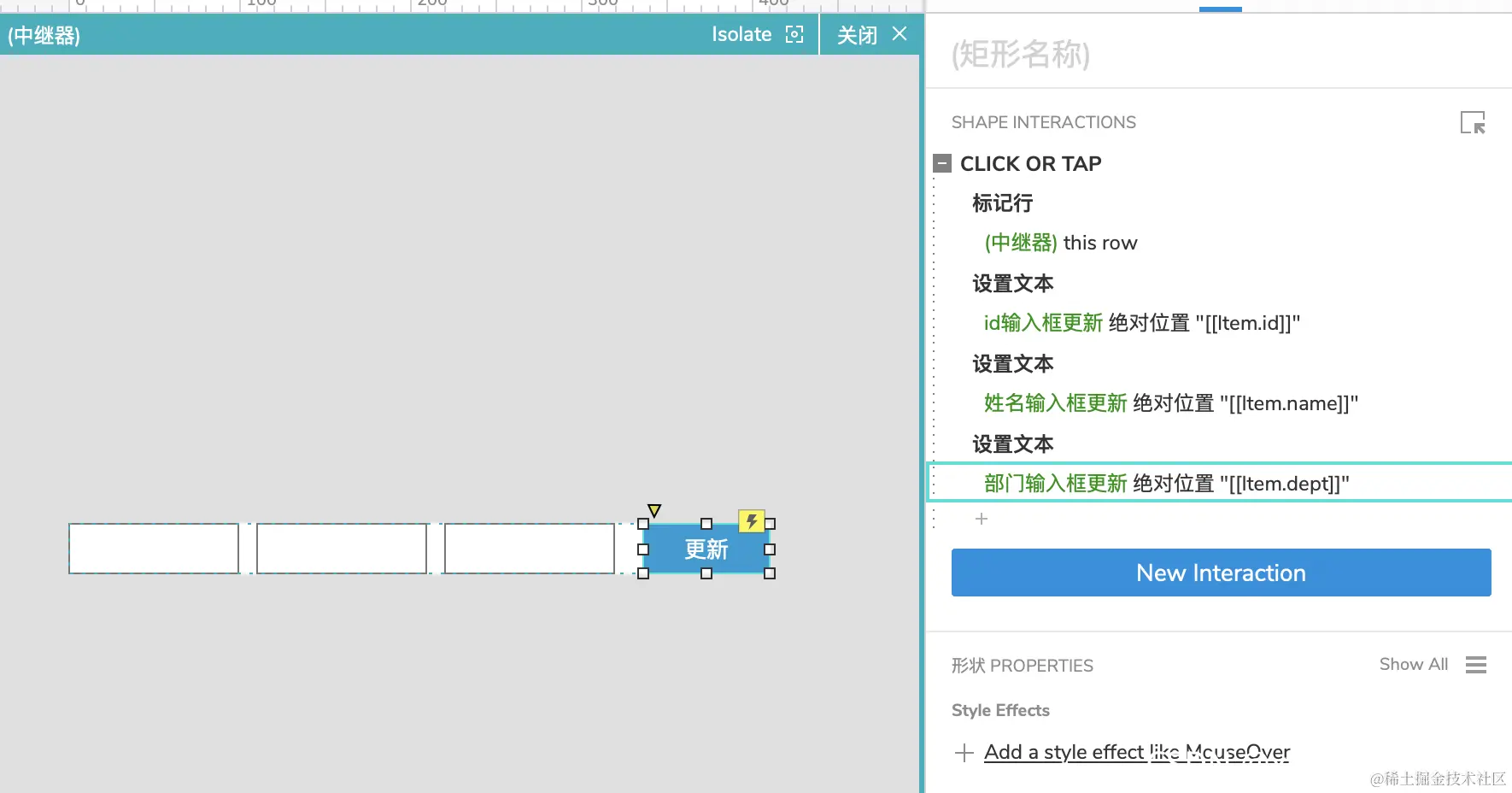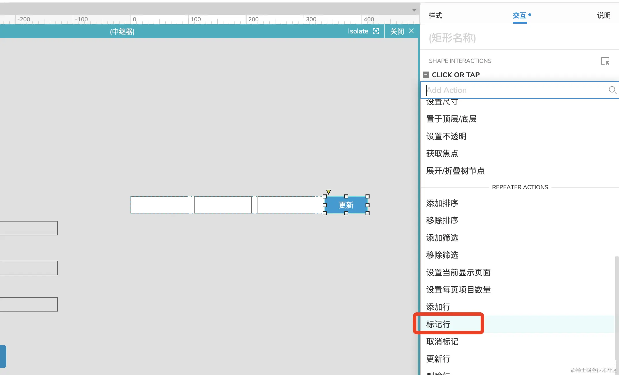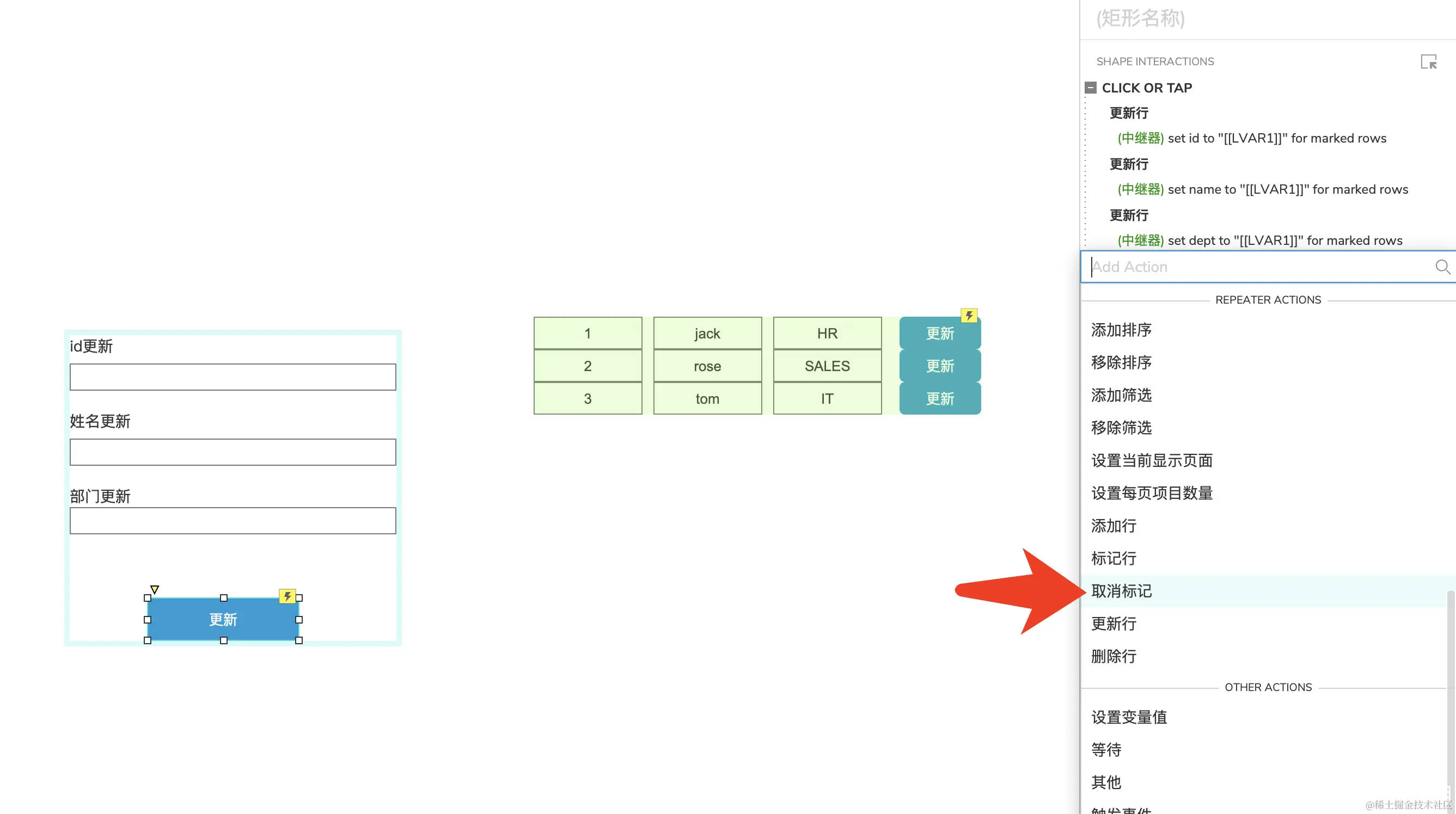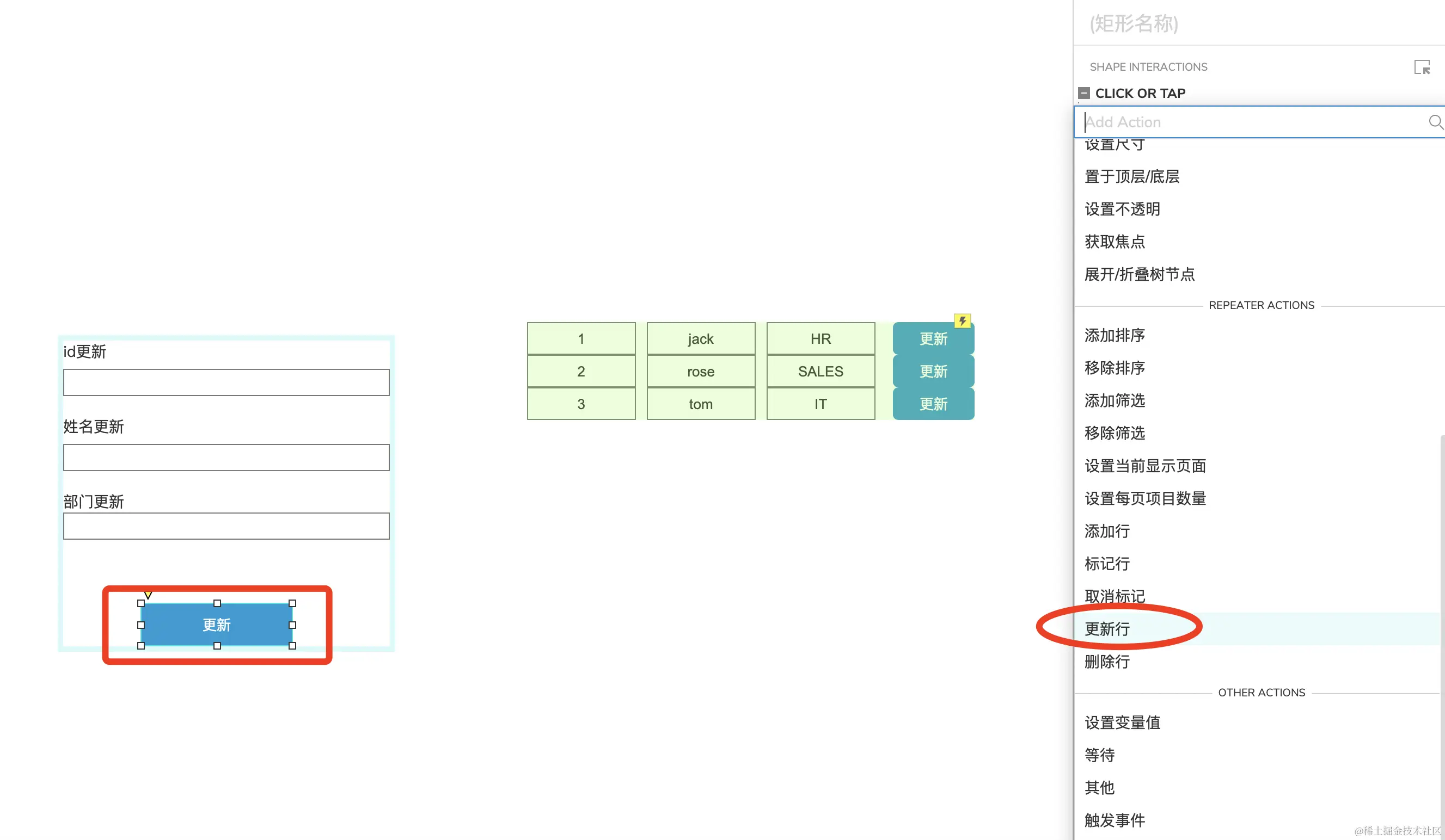 选中中继器里面【更新】按钮,添加事件,选择设置文本。