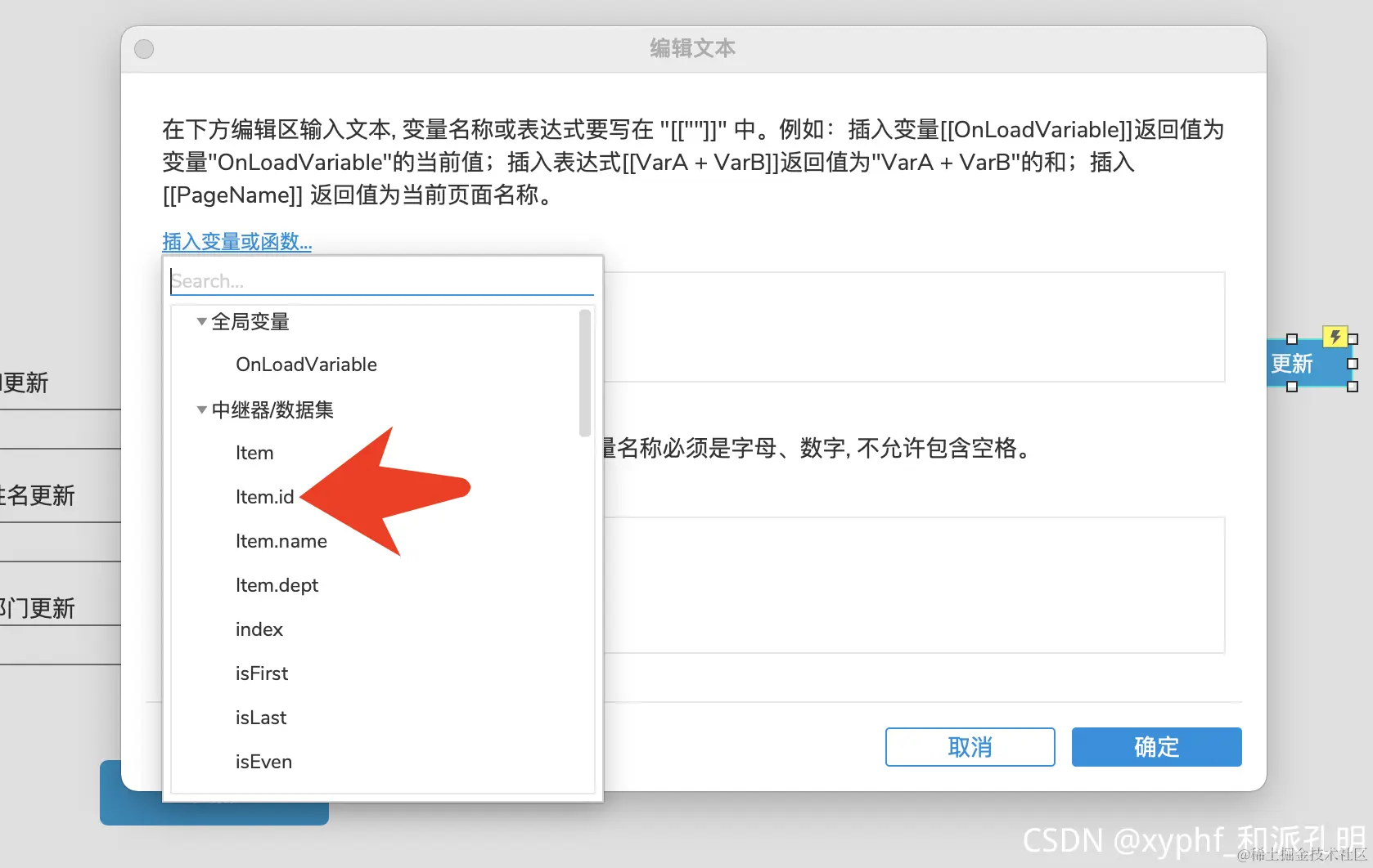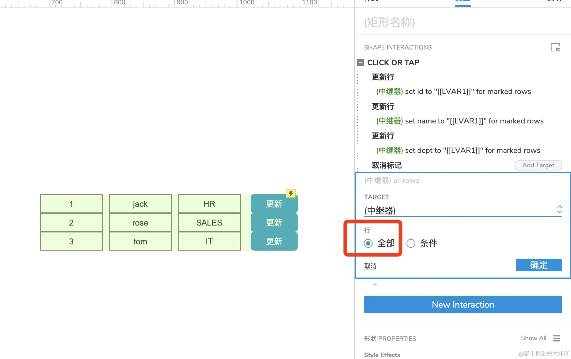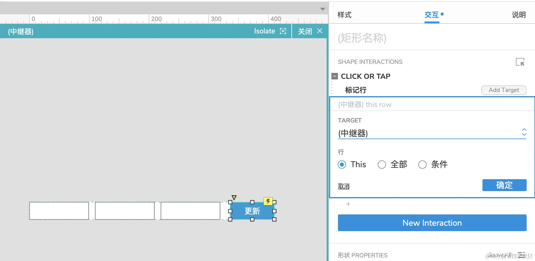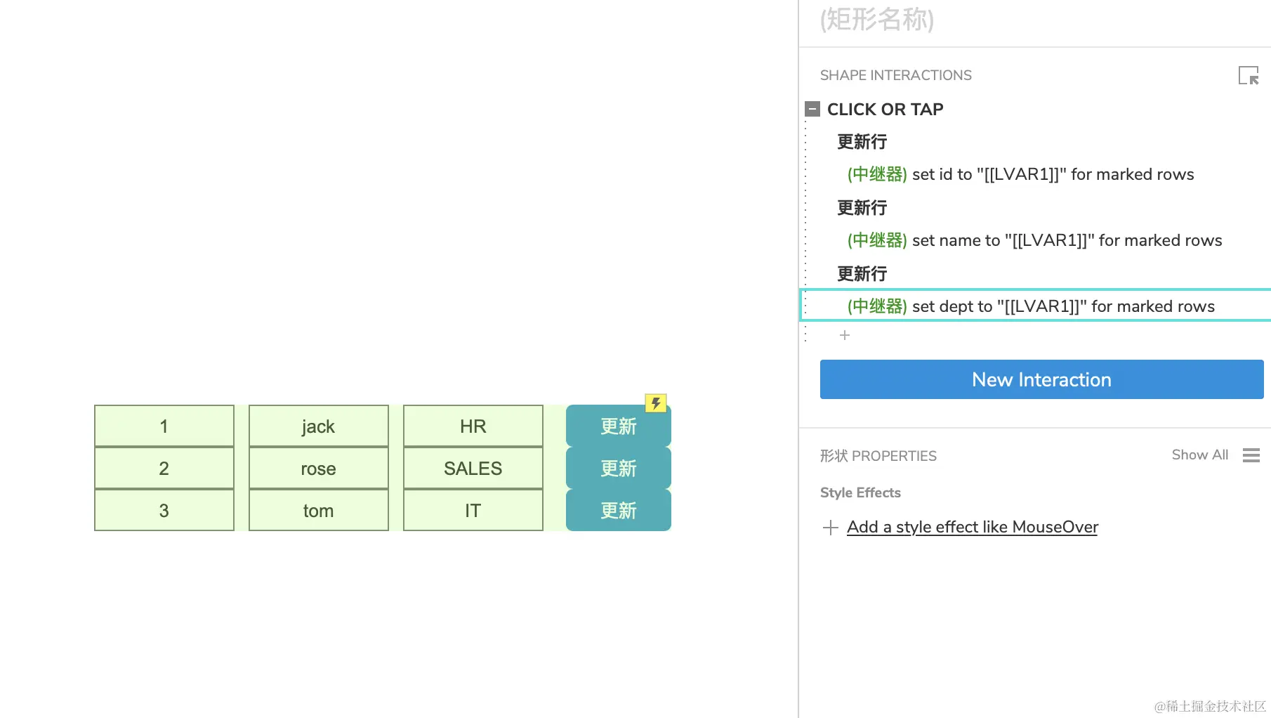 选中中继器里面【更新】按钮,添加事件,选择设置文本。