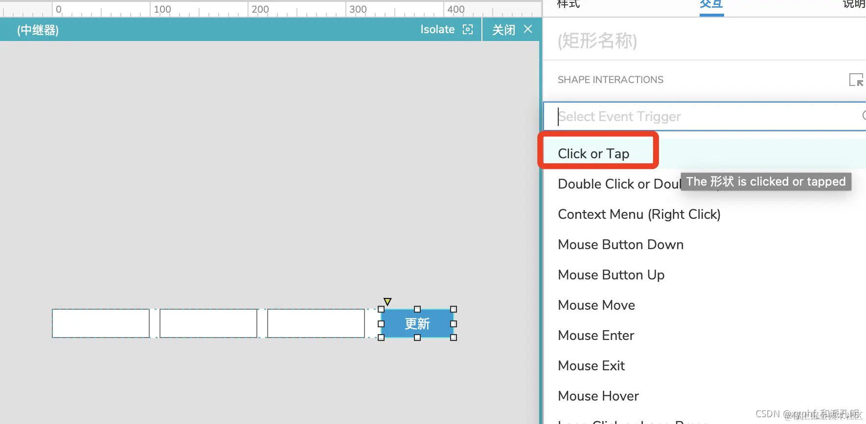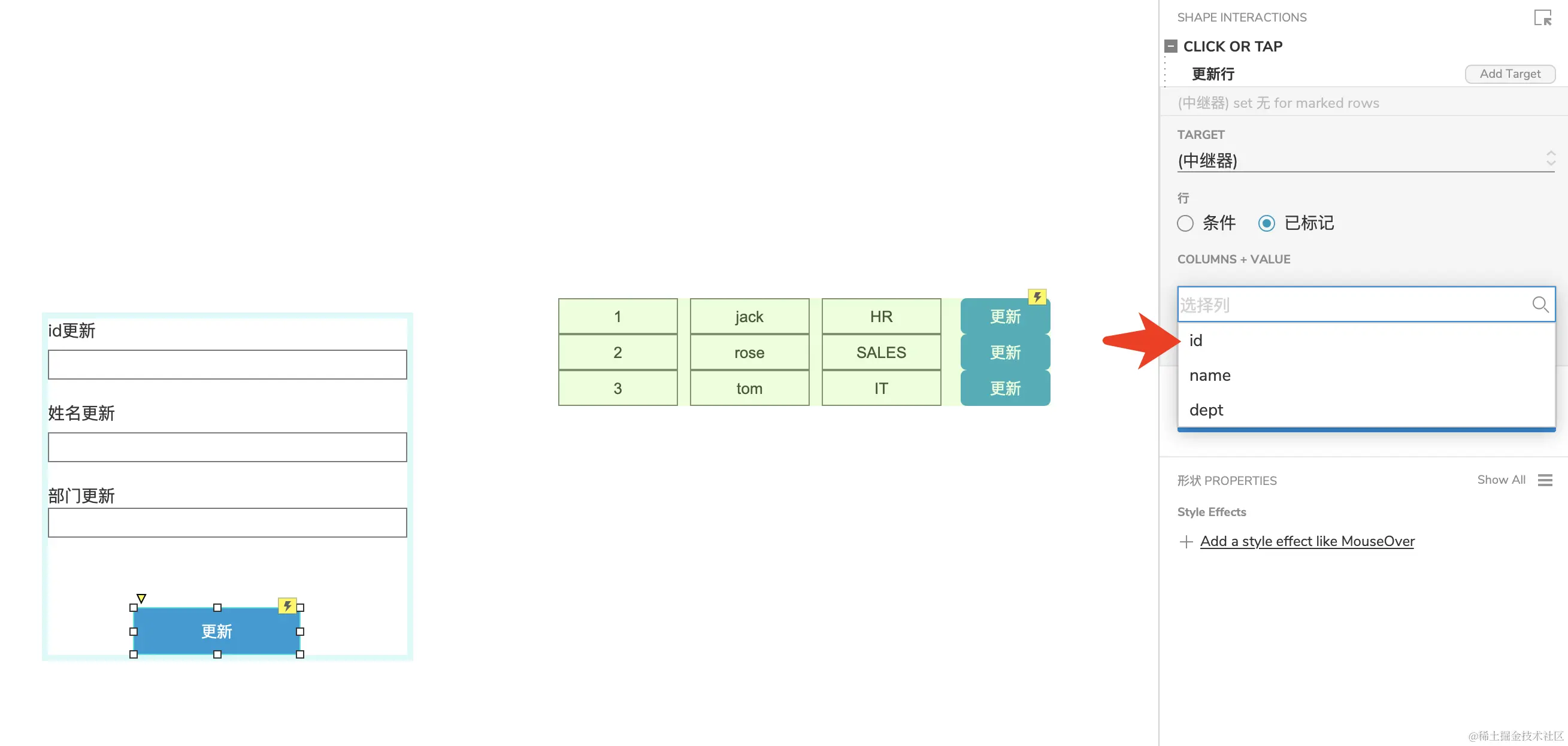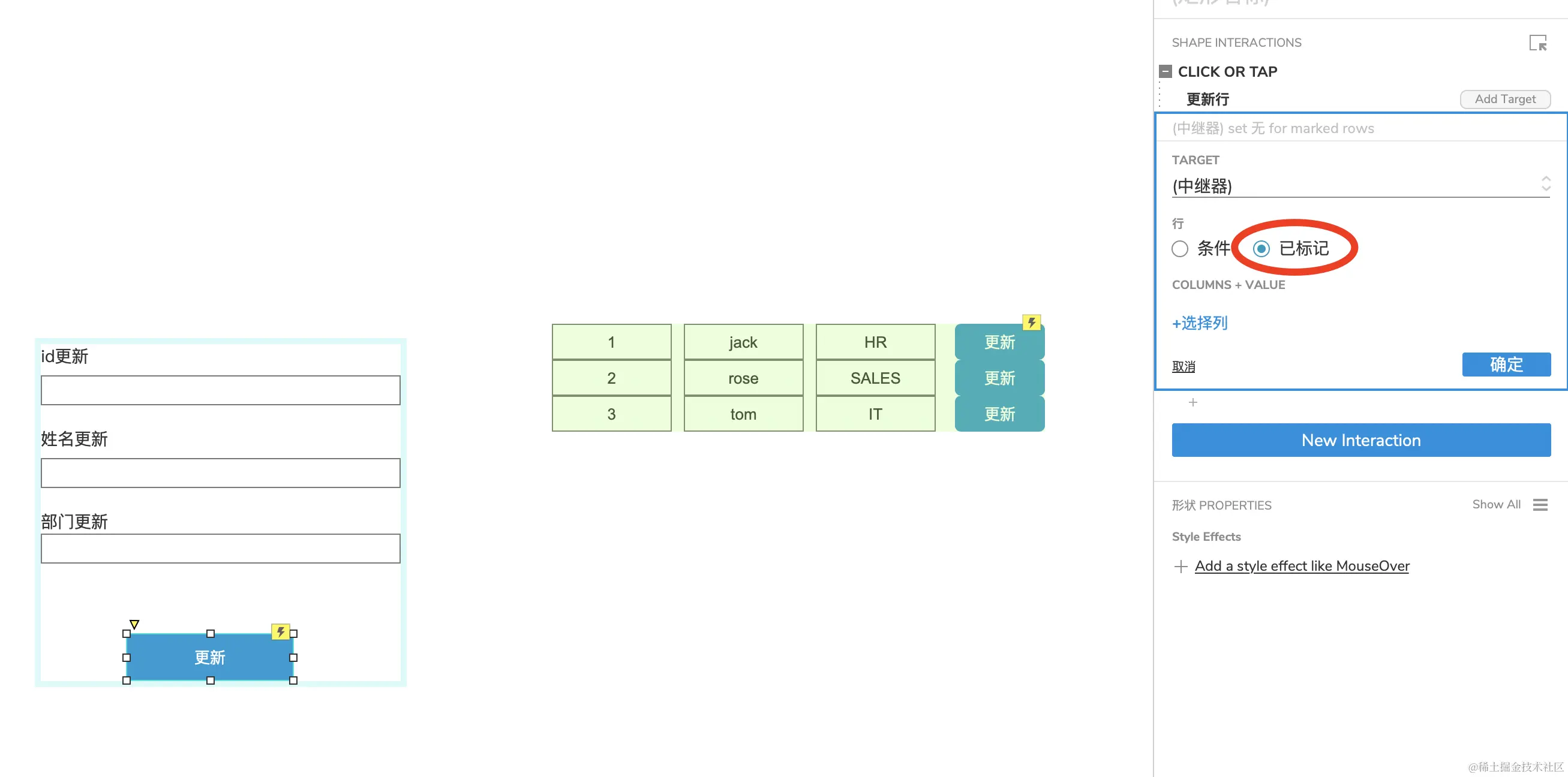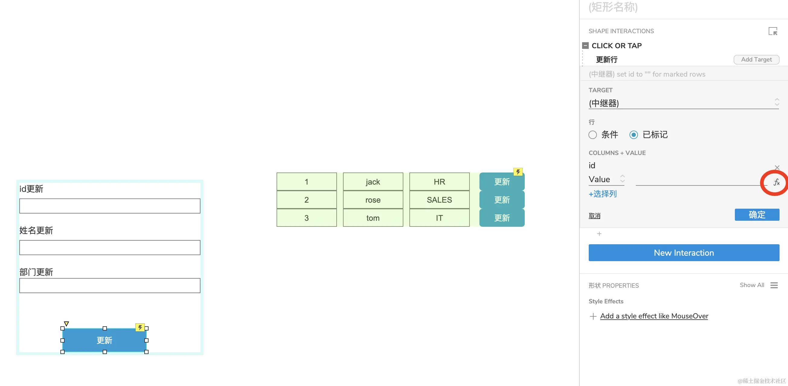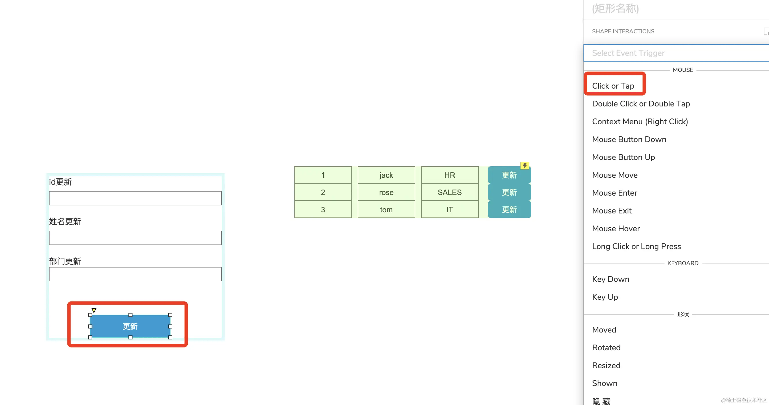 选中【更新】按钮,添加点击事件