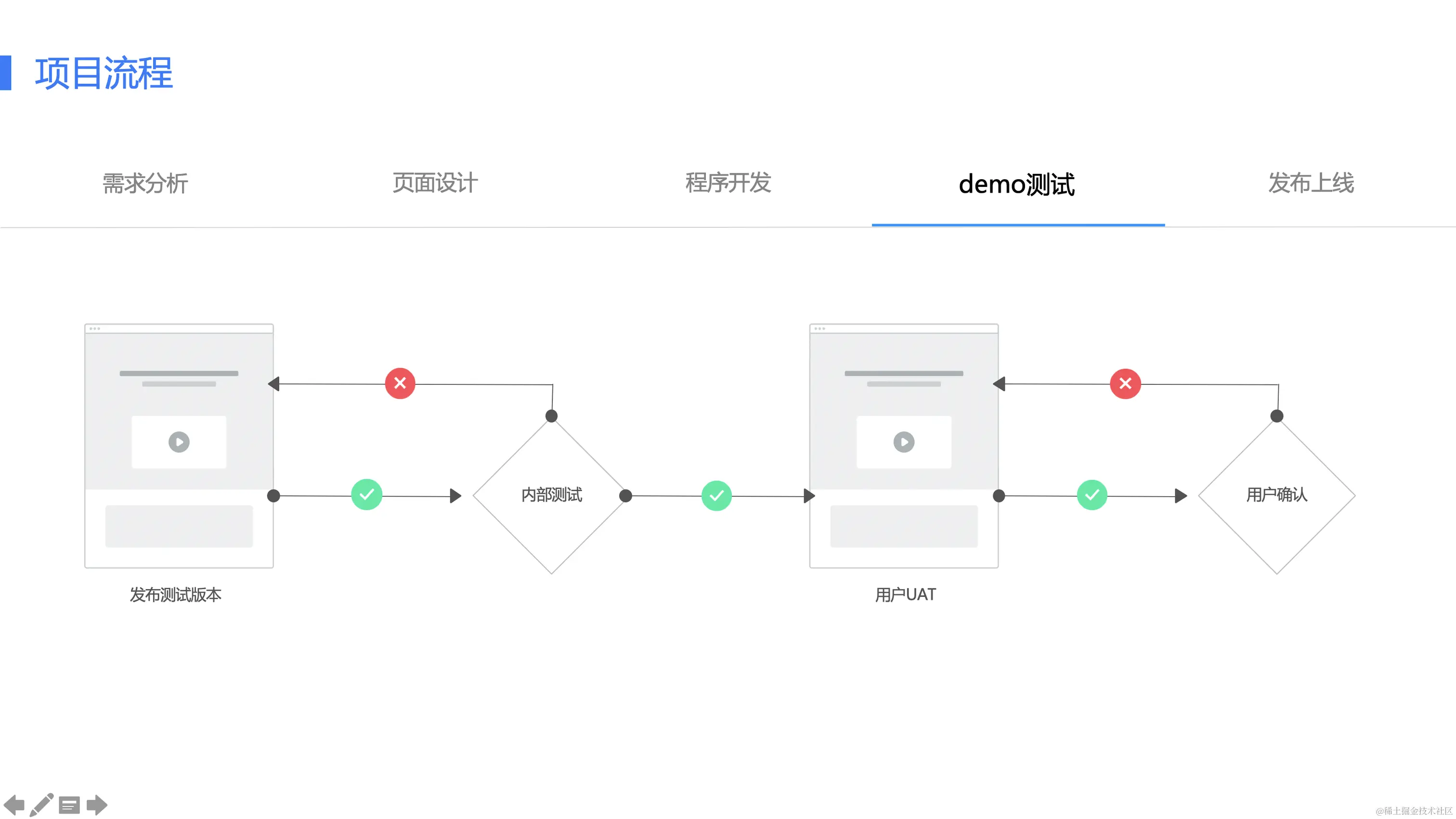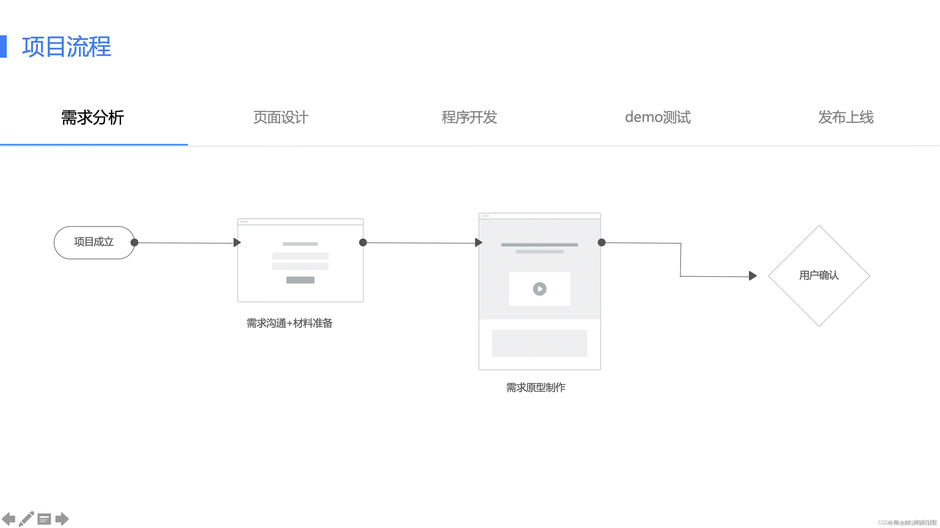 | ## 项目各阶段主要交付物| 启动与计划 | 策划与设计 | 开发阶段 | 测试阶段 | 交付阶段 | | -------- | ---------- | ------- | --------- | ------- | | 1、项目计划 | 1、原型文件 | 1、测试用例 | 1、测试报告 | 1、软件源代码 | | 2、账号信息汇总 | 2、设计稿及其源文件 | 2、需求变更单 | 2、buglist | 2、项目验收单 | | | 3、需求说明书 | 3、软件源代码 | 3、用户操作手册 | |风险评估矩阵丨需求变更单丨会议纪要丨项目进度周报 | | | | | | -------------------------------------------------------------------------------------------------------------------------------------------------------------------------------------------------------------------------------------------------------------------------------------------------------------------------------------- | - | - | - | - |