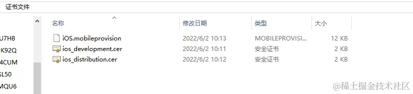 下面截图的第一个就是从苹果开发者后台下载下来的描述文件,后两个是开发和发布的证书文件(需要在mac里用密码钥匙串导出成 p12 文件才可以用来打包),添加设备后证书文件不用去更新,只用更新第一个 iOS.mobileprovision 描述文件: