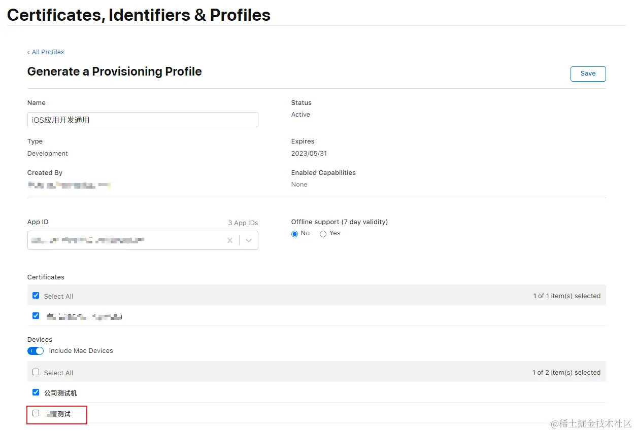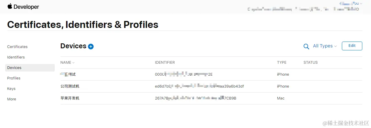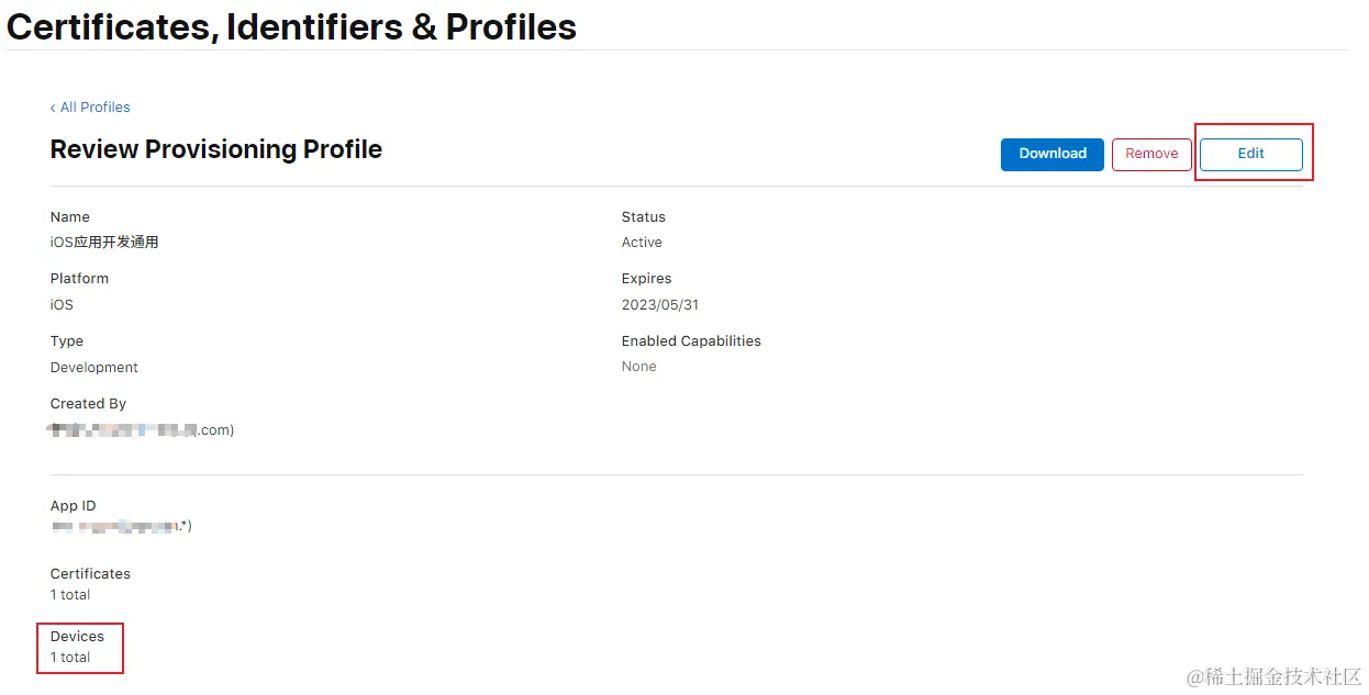 发现描述文件详情里面的设备 Devices 那果然只有之前添加的一个,新加的设备没包含在里面,然后点击右上角的 Edit: