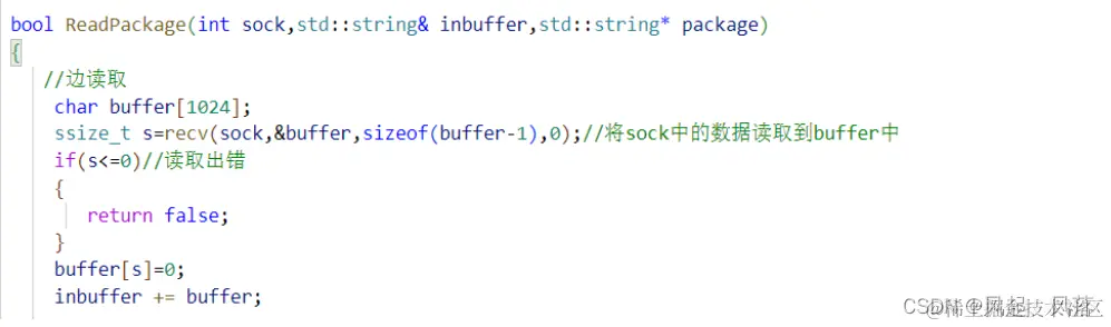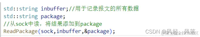定义一个string类型的package,从套接字sock读取,将结果添加到package中 若有完整报文就交给package,没有完整报文,则一直读取 inbuffer 用于记录报文的所有数据