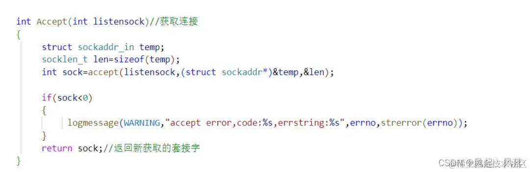 sock 这个文件描述符 是真正给用户提供IO服务的 若连接失败,则返回-1,使用日志将错误信息打印出来