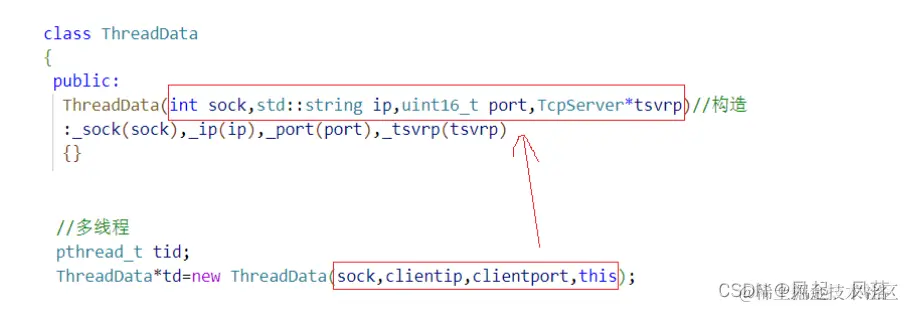 在初始化 多线程部分,new对象,将sock clientip client port 与this指针传递过去作为参数 完成构造