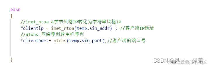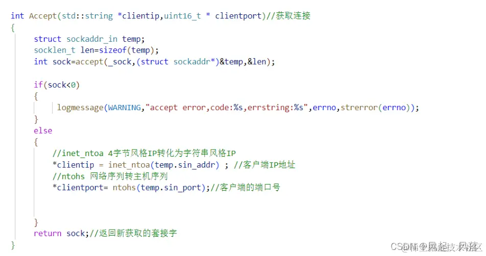若连接成功,则需获取到对应的客户端的 端口号 与客户端的IP地址 使用 inet_ntoa 4字节风格IP转化为字符串风格IP 使用 ntohs 网络序列转主机序列