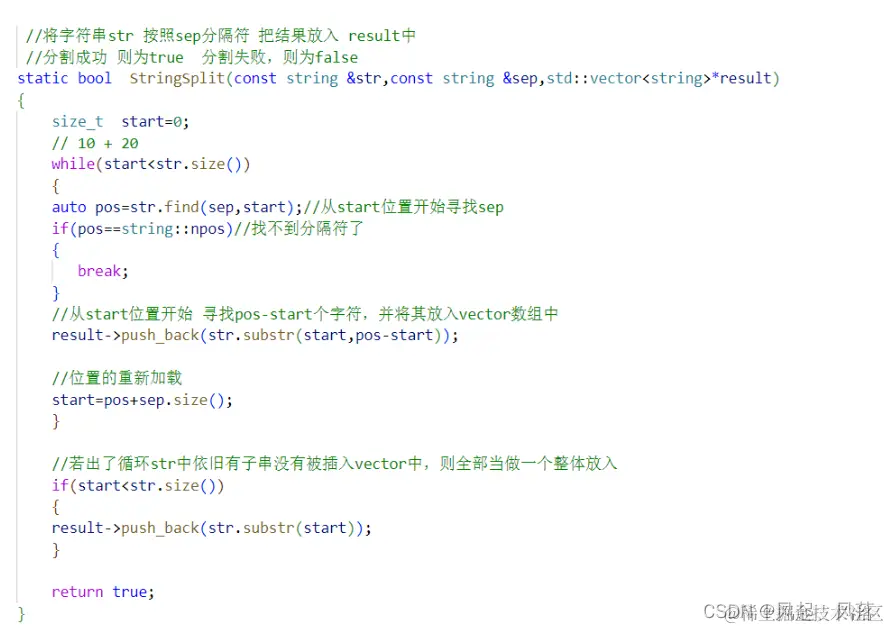 寻找SEP分割符所在位置,即可分割出区间 使用find函数,从start位置开始寻找分隔符sep,找到分割符sep后,将区间内的子串插入vector数组中