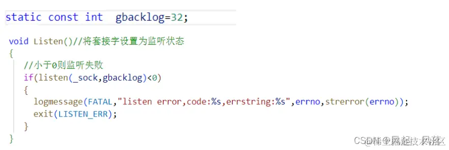 若小于0,则监听失败 依旧使用日志打印处错误码和错误原因,再终止程序