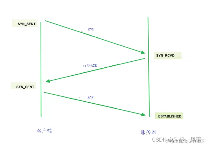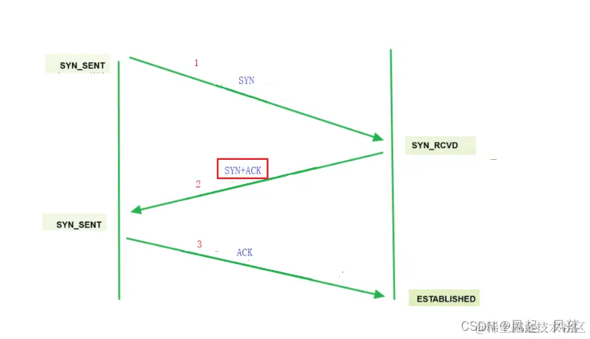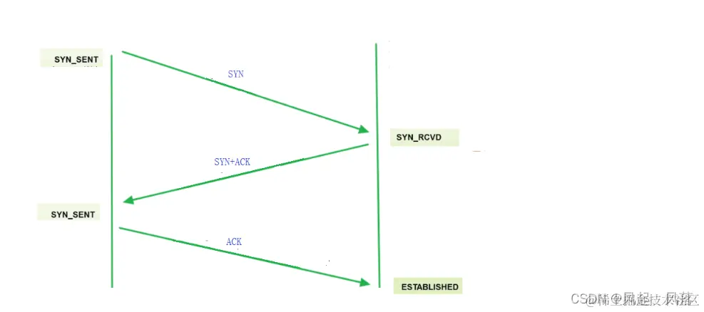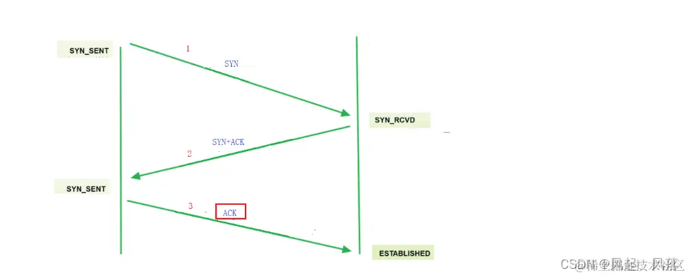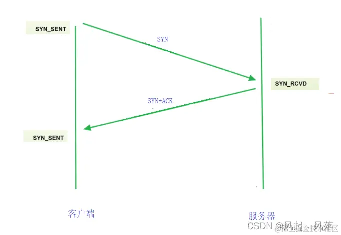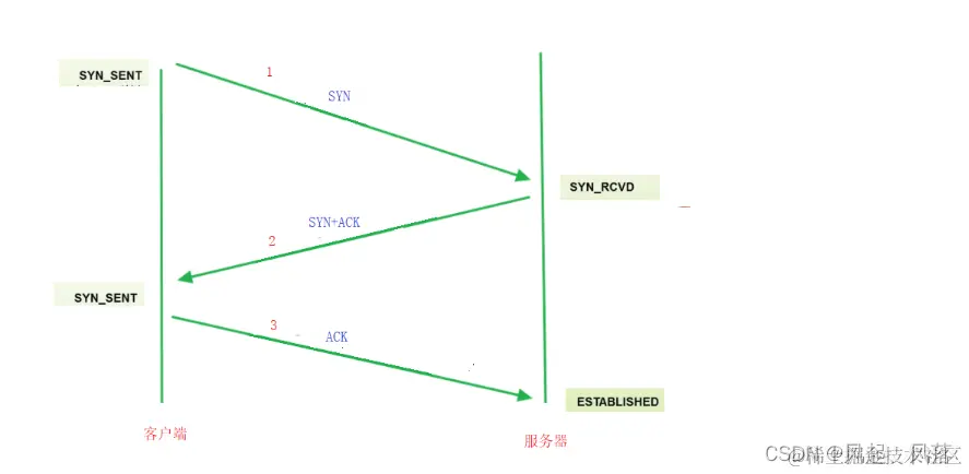 客户端只要把 SYN 发出去了,客户端的状态变为 SYN_SENT,称为 同步发送 只要服务器端收到 SYN,服务器端的状态 变为 SYN_RCVD 服务器端再进行 SYN+ACK 响应,响应后 客户端收到了ACK,并且发出ACK时,客户端的三次握手就完成了