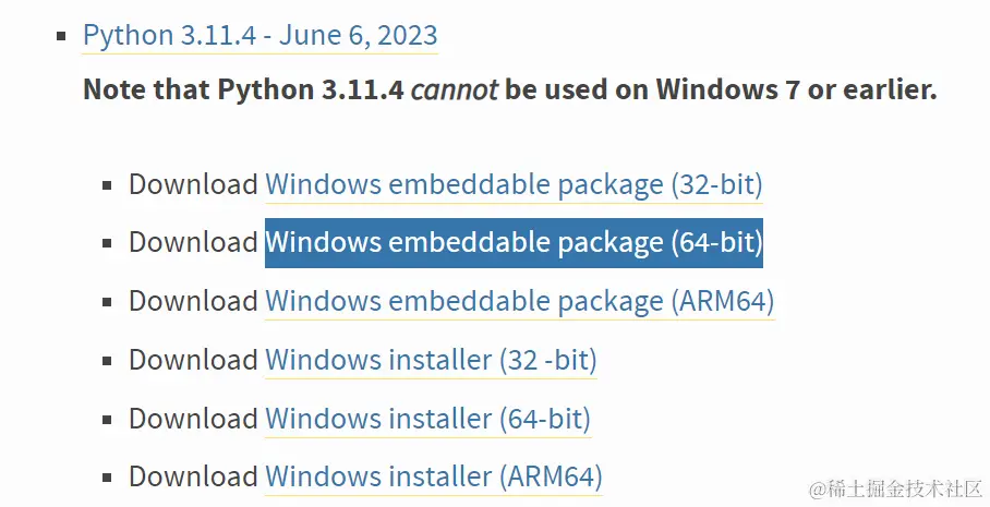 下载Windows embeddable package (64-bit)安装包,注意是embeddable版本的,并不是传统安装包,同时版本也需要和开发项目的Python版本吻合: