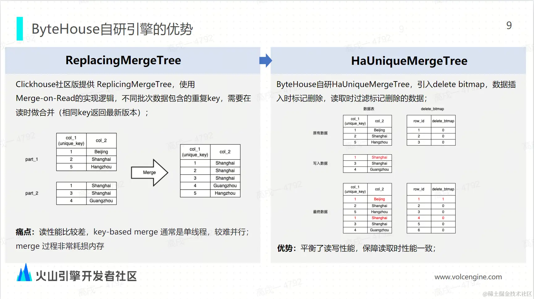 ByteHouse 自研的HaUniqueMergeTree: 引入了 delete bitmap 的组件在数据插入时即标记删除,然后在数据查询时过滤掉标记删除的数据。优势在于,整体上平衡了读和写的性能,保障了读取时性能一致性。