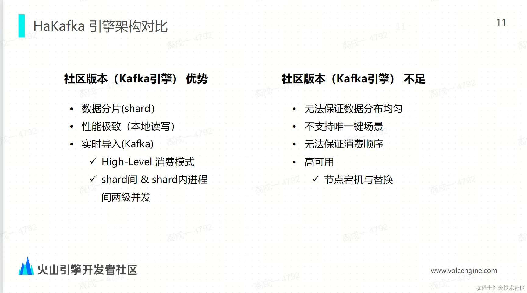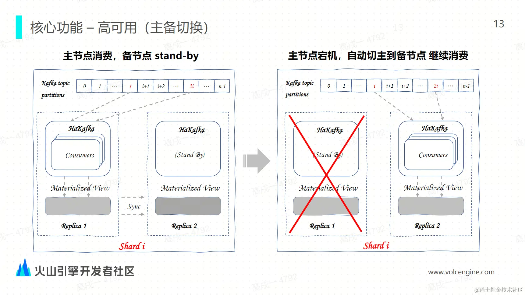 社区版的 Kafka 引擎没有高可用,即使ClickHouse是多副本的,在当一个节点发生宕机时,无法保证另一个节点继续消费。