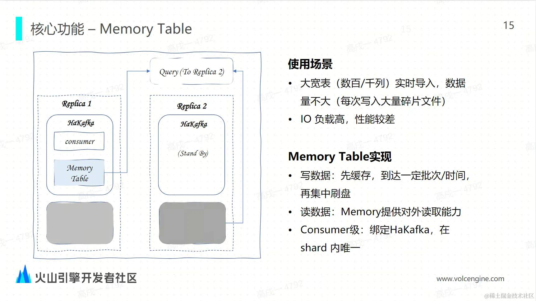 不同于社区的Memory Table和底层存储绑定,ByteHouse的Memory Table是和Hakafka绑定的,主要使用在有百列或者千列的大宽表的场景。