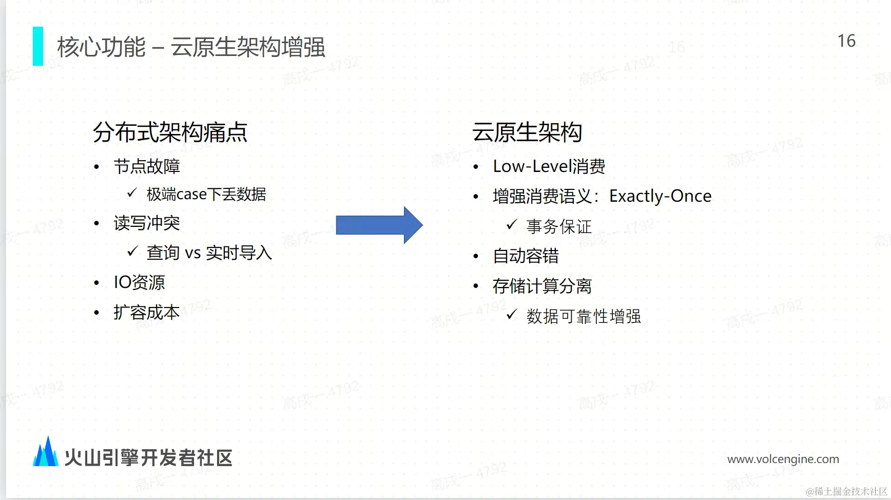 云原生架构优点在于,存算分离、自动扩容、自动容错轻量级的扩缩容等,因为云原生支持事物,让我们可以将消费语义增强到exactly once。