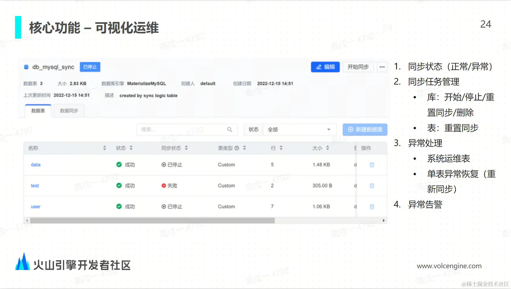 通过可视化的任务监控和任务启停异常的重启任务告警这些方式实现了物化 MySQL 的可视化易用性的极大提升。