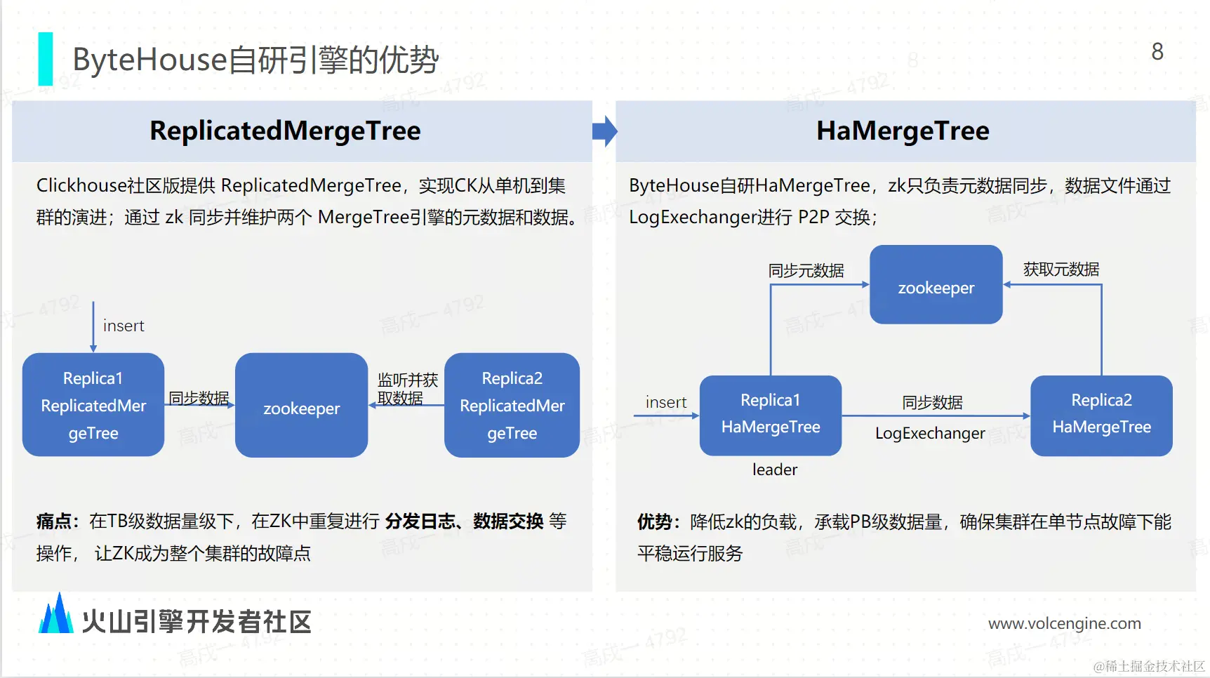 ByteHouse 自研HaMergeTree: 将元数据的同步和数据的同步解耦,ZK只负责元数据的同步,而数据的同步是通过 LogExchange 来实现,在两个MergeTree之间进行对等拷贝。优势在于,降低了 ZK 的负载,即使是承载 PB 级的数据量,集群也能够平稳地运行。