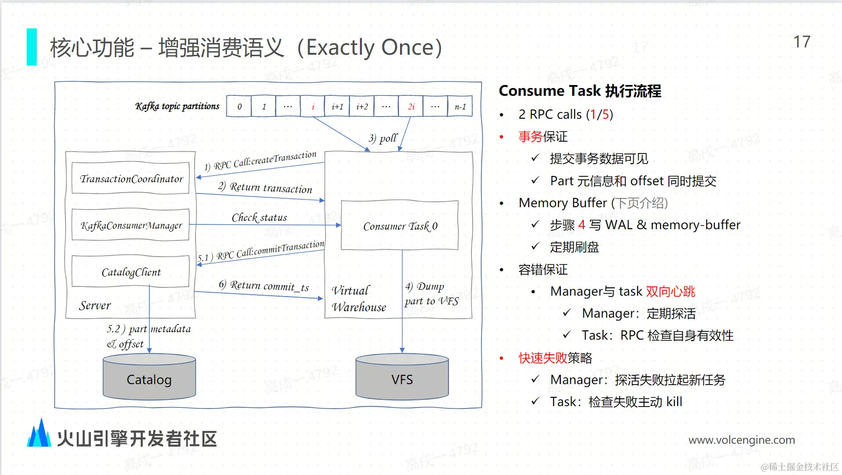 - 事务保证: 因为云原生架构有事务的支持,所以每一轮的消费都需要有事物来保证。因为 Catalog 的元信息和 Catalog 元信息的交互是在 Server 端进行的,所以第一步会通过 RPC 的请求向 Server 端请求创建消费事务,然后客户端创建正常,创建消费事务之后会把 transaction ID 给consumer, consumer 拿到这种全声音 ID 之后就可以开始正常地消费了。之后它就会从分配到的 partition 里面不停地消费数据,当消费到足够的数据量或者消费满足一定的时间时,它就会把消费的这数据转换为对应的 part 文件并dump到存储层。在 dump 之后,数据是不可见的,因为这个时候的 transaction 还没有提交,所以在第五步的时候,还是会通过一个 RPC 的 call 把刚才 dump 的元信息消费的 offseed 提交到 catalog 中。这一步是一个原子性的提交,也是我们的消费语义升级从 at least once 到 exactly once 的一个核心关键点
