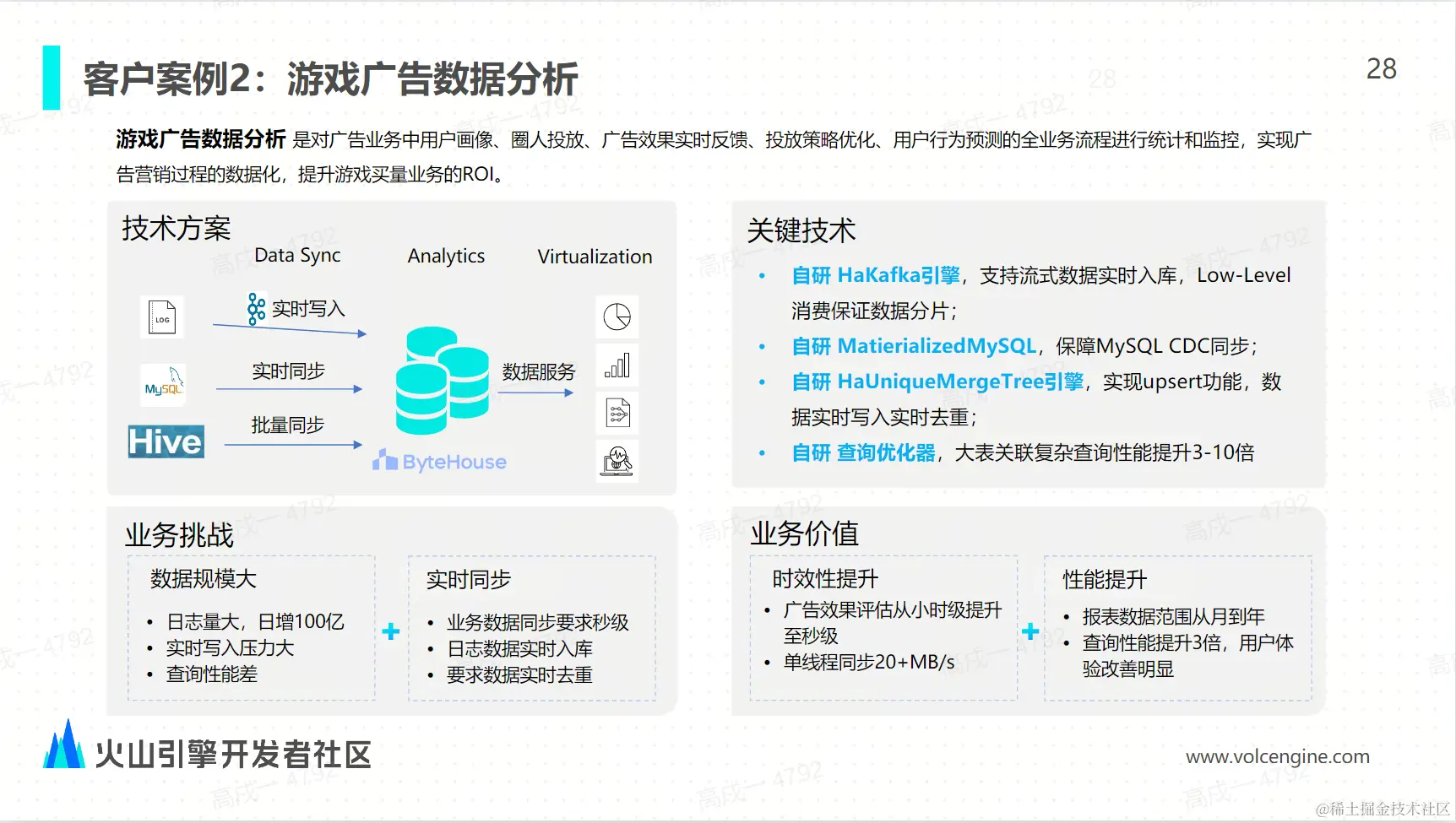 - 解决方案: 首先使用 Kafka 引擎来支持流式数据写入,通过 low level 消费模式保障数据的有序分片,再通过 Unique引擎来实现数据的唯一性,并且实时地去重。在业务数据方面,我们使用物化MySQL来保障业务数据从 MySQL 到 ByteHouse 之间能够实时同步。最后使用自研的查询优化器来优化查询性能,通过ByteHouse 的优化之后,广告效果分析从原来的小时级提升到了现在的秒级延时数据查询的性能,单线程同步 20+MB/s ,并且整个查询性能提升了 3 倍,用户的收益和体验得到了明显的改善。