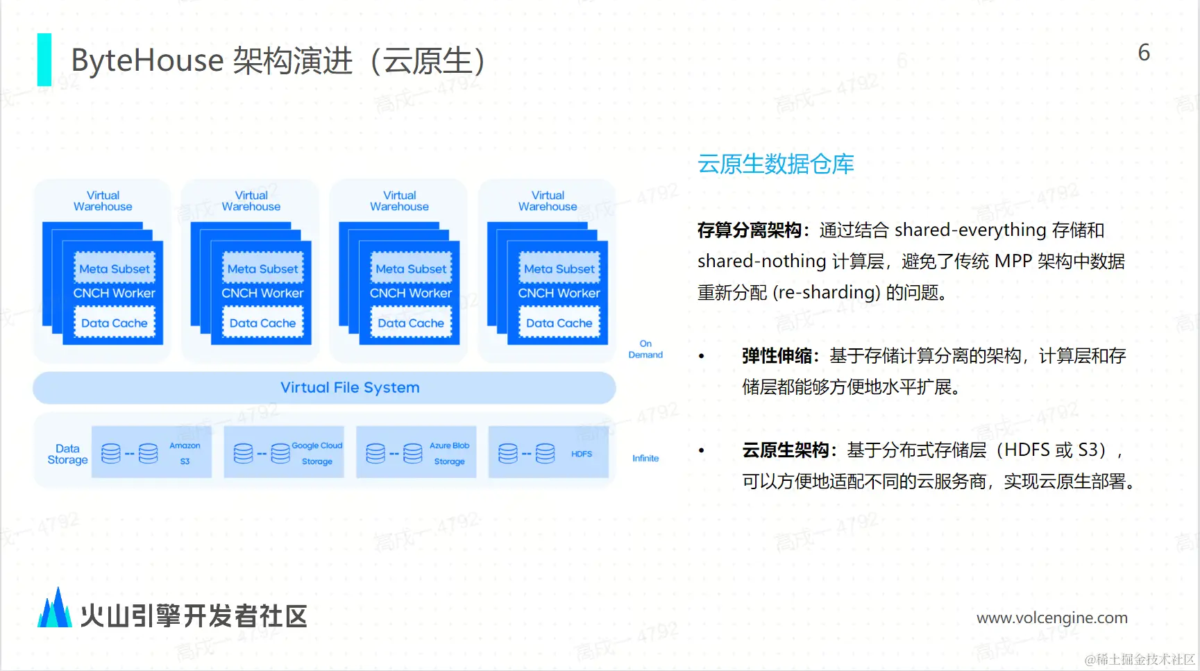 本篇文章来源于ByteHouse产品专家在火山引擎数智平台(VeDI)主办的“数智化转型背景下的火山引擎大数据技术揭秘”线下Meeup的演讲,将从ByteHouse数据库架构演进、增强HaKafka引擎实现方案、增强Materialzed MySQL实现方案、案例实践和未来展望四个部分展开分享。