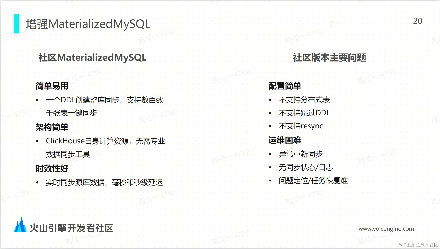 社区版本的这种物化MySQL 在很大程度上去解决了 MySQL 数据库到 ClickHouse 之间的这种实时同步。在实际业务、实际场景中,遇到不少问题: