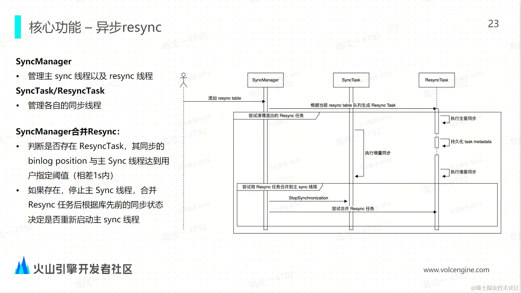 这里有三个对象, SYNC manager是用来管理主 SYNC 线程和 Resync 线程,然后 SYNC task 和 resync task 各自管理各自的任务。比如说一个 MySQL 的库有 100 张表,我们选了 50 张表进行同步,所以在同步进行过程中,当 think task 同步到 binlog 的 position 位置,比如到 1000 的时候,用户修改了配置之后,它增加了 30 张表。增加 30 张表的时候, SYNC manager 就会启动 Resync task 去同步另外 30 张表,那这个时候 SYNC task 是继续执行的;RESYNC task 会从 position 0 开始,它先做全量的同步,然后再做增量的同步。所以当到达某一个阶段,比如说 sync task 跑到了 position 1500 的时候, resync task 跑到了 position 1490 的时候,这时 SYNC manager 就会去判断两者的误差,这个 position 的误差在一定的阈值之内,在一定阈值之内之后,它会将 SYNC task 停止1秒钟,将 RESYNC task 合并到 SYNC task 中。合并成功之后,这 80 张表就都会通过SYNC task 继续同步,而 RESYNC task 这个任务就会被停止掉。这就是现在 RESYNC task 做了一个能力实现。