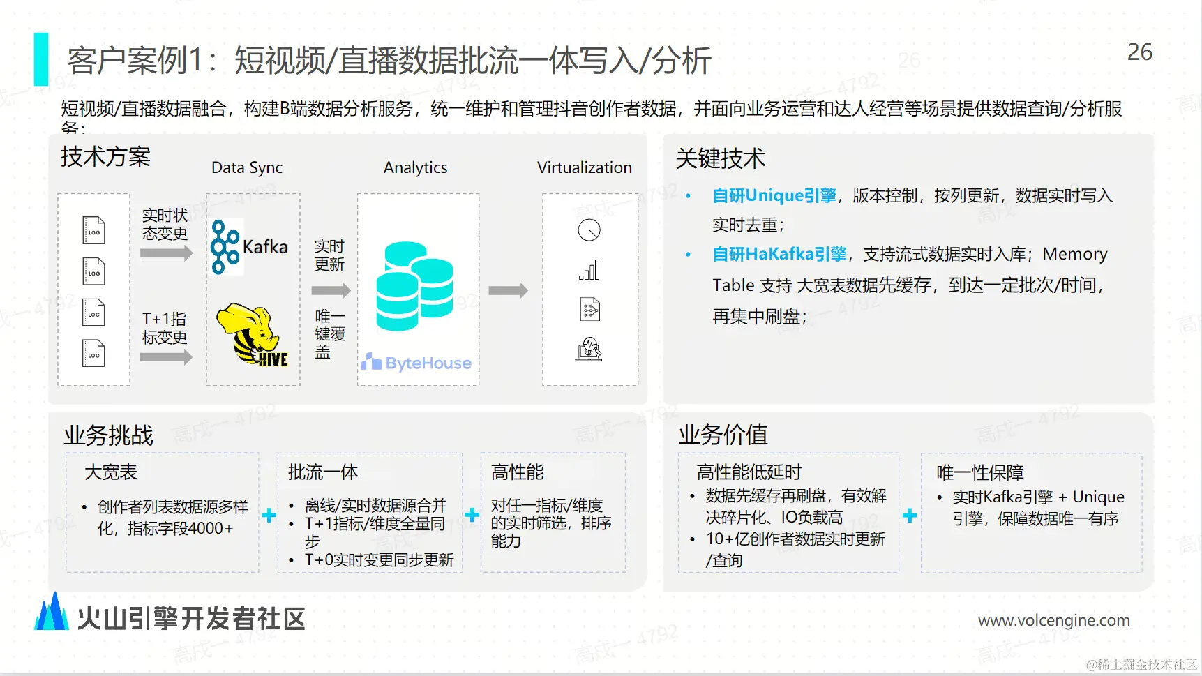 - 解决方案: 第一,我们采用了自研的 Unique表引擎来做实时的去重,并且能够让数据在写入时就可以实时去重、实时查询。第二,通过 Kafka 引擎的 memory table 来实现大宽表数据先缓存,到达了一定的批次之后再集中刷盘。通过对 Byte house 的优化方案有效地解决了碎片化、IO负载高的问题,能够支持 10 亿+创作数据实时写入和实时查询。